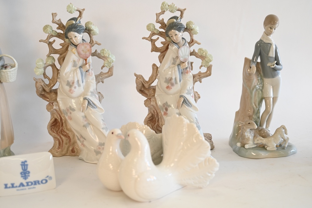 Seven Piece Lot of Porcelain Lladro Figures, to include two geisha figures, doves, a shepherd (missing staph), two children with ani…