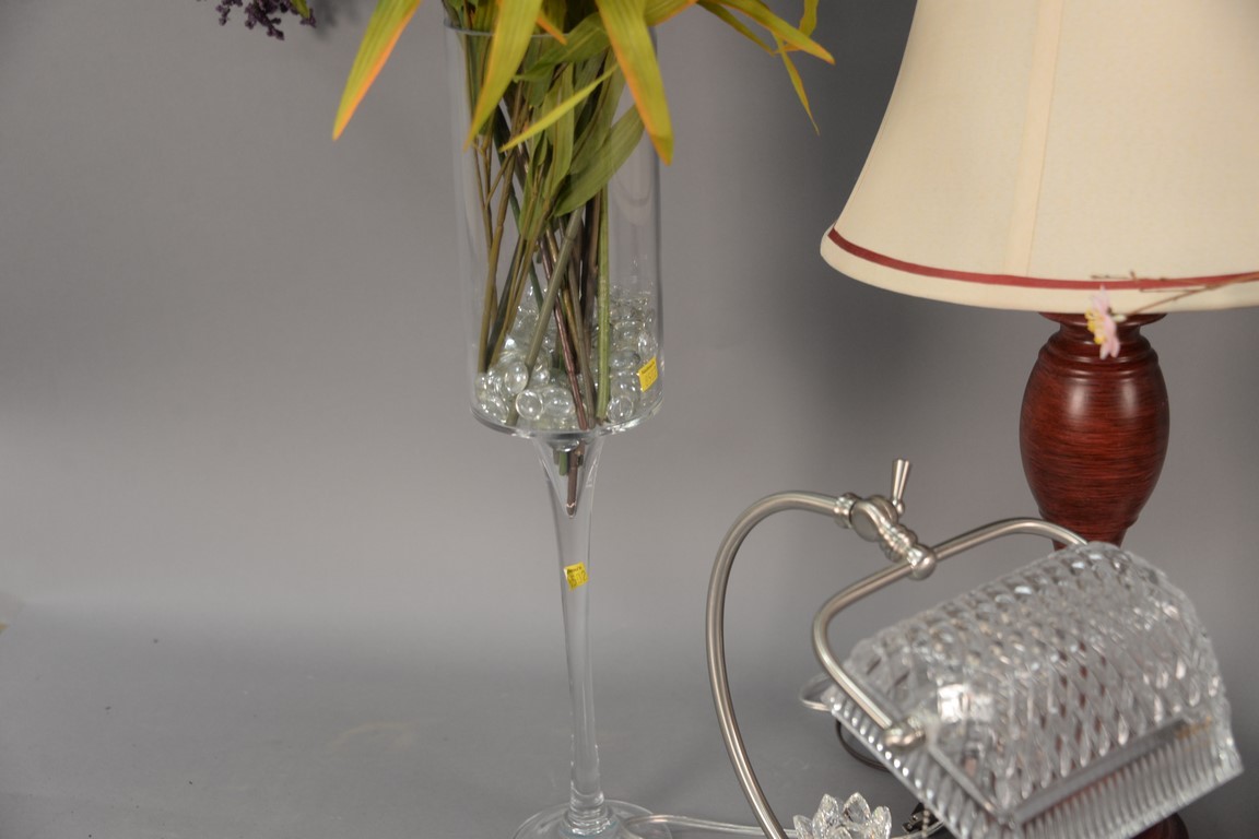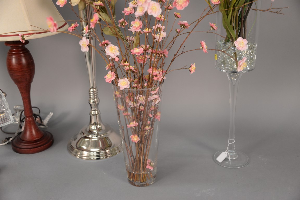 Lot 335: Six piece lot including candelabra, three vases with artificial flowers, and two lamps. ht. 15in. to 50in.