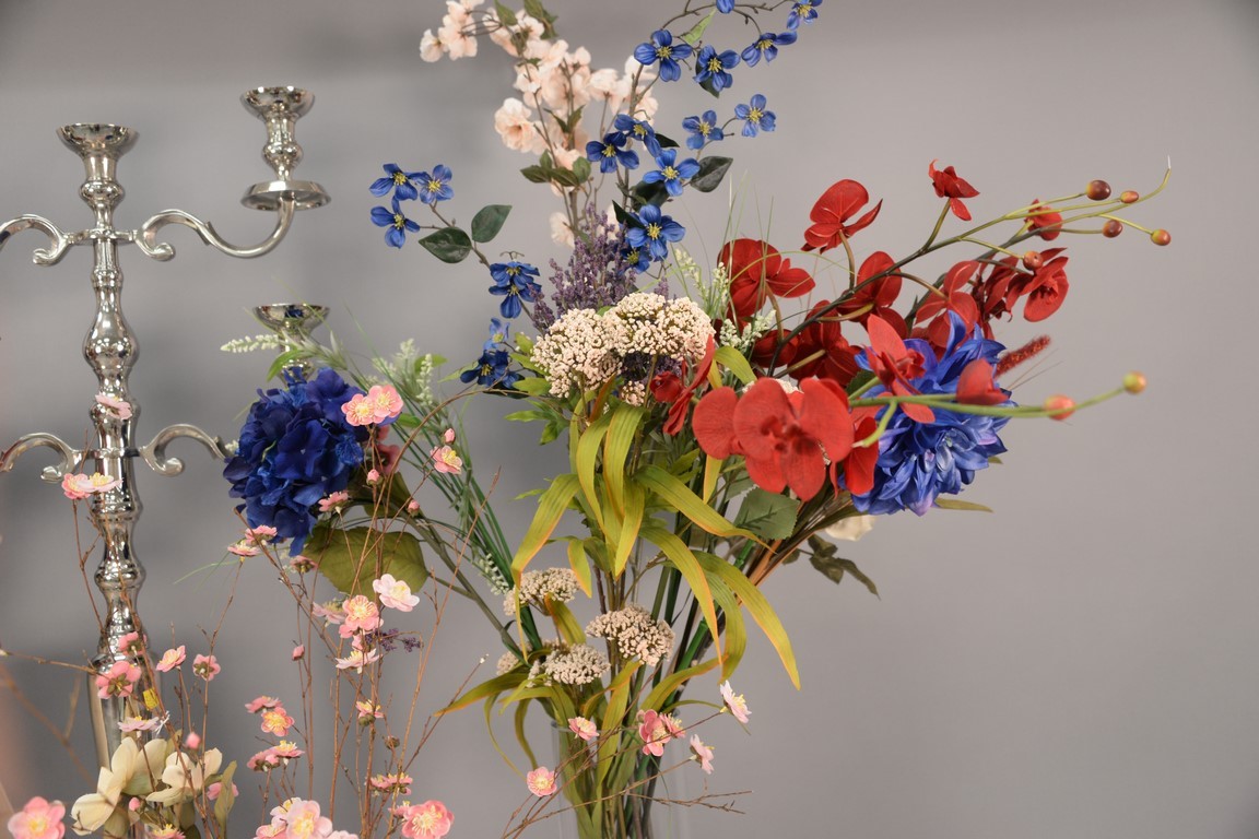Six piece lot including candelabra, three vases with artificial flowers, and two lamps. ht. 15in. to 50in.