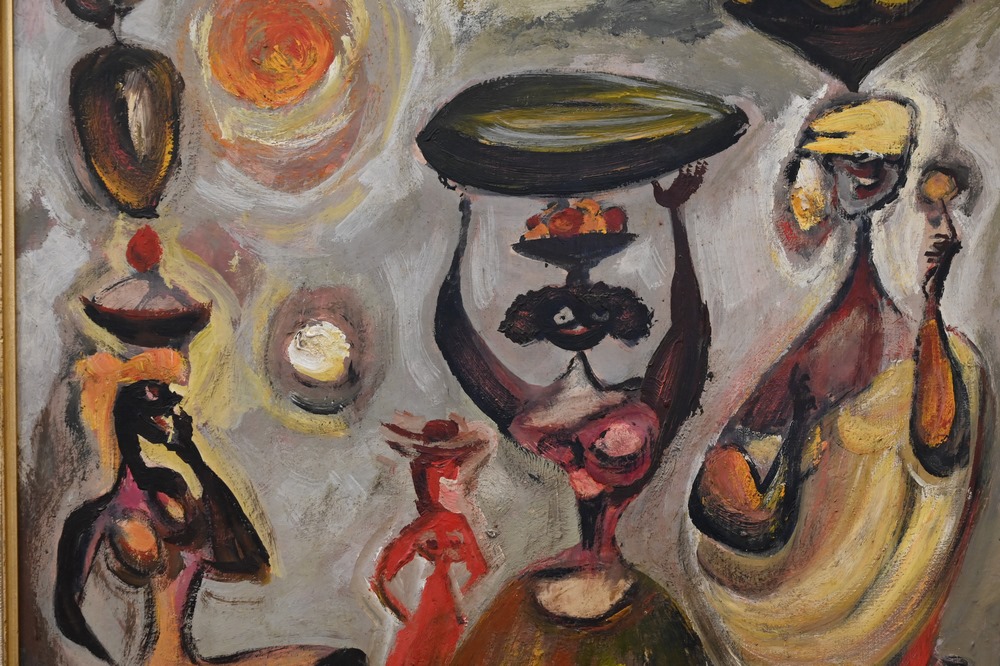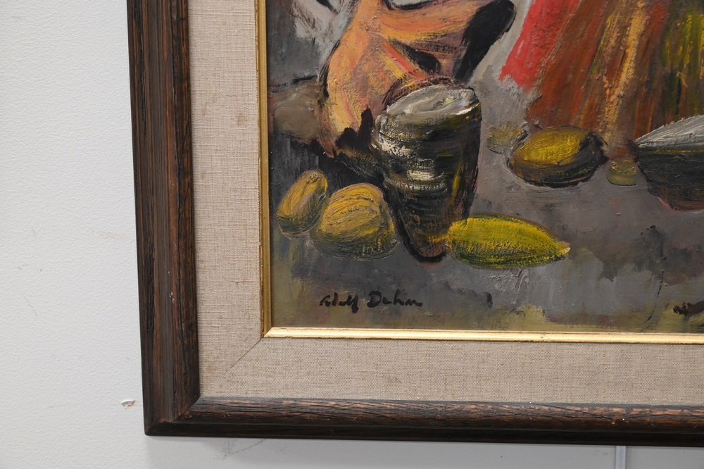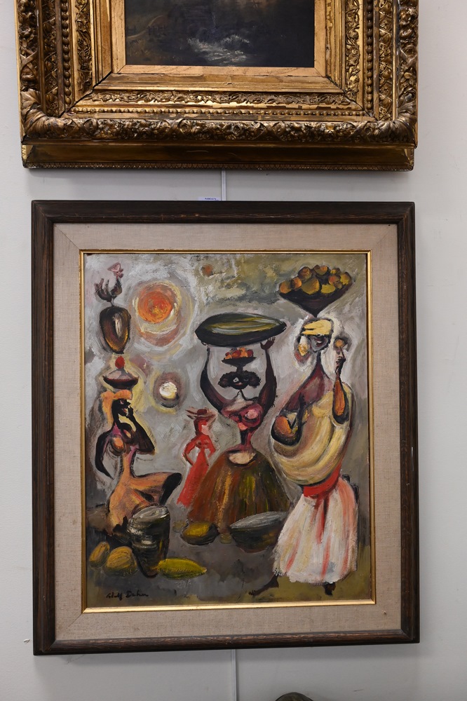 Lot 336: Adolf Arthur Dehn (1895 – 1968), “Caribbean Sun”, oil on board depicting figures with fruit, signed lower left Adolf Dehn, 21 1/2 x 17 1/2 inches.