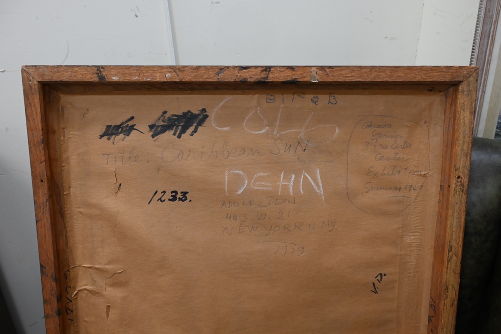 Adolf Arthur Dehn (1895 – 1968), “Caribbean Sun”, oil on board depicting figures with fruit, signed lower left Adolf Dehn, 21 1/2 x 17 1/2 inches.