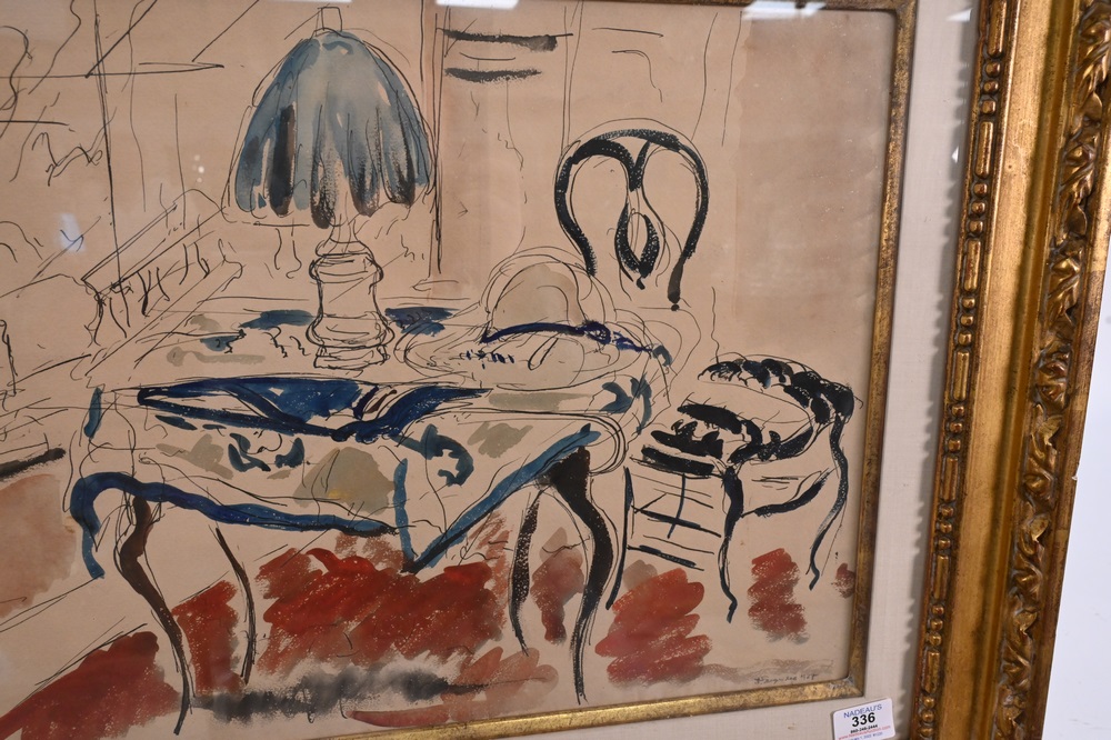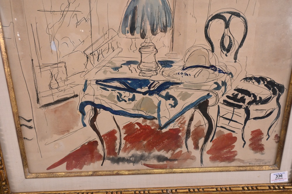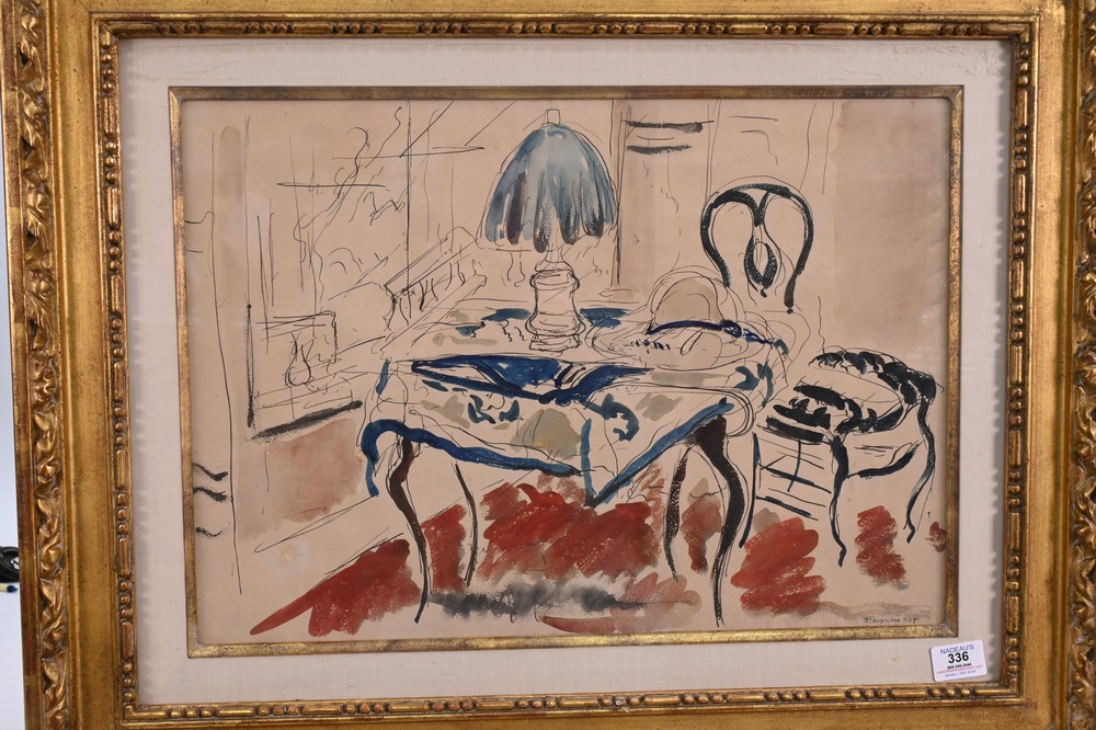 Lot 336: Andre Albert Marie Dunoyer de Segonzac (1884 – 1974), Segonzac Interior, table with lamp, watercolor and ink on paper, signed lower…
