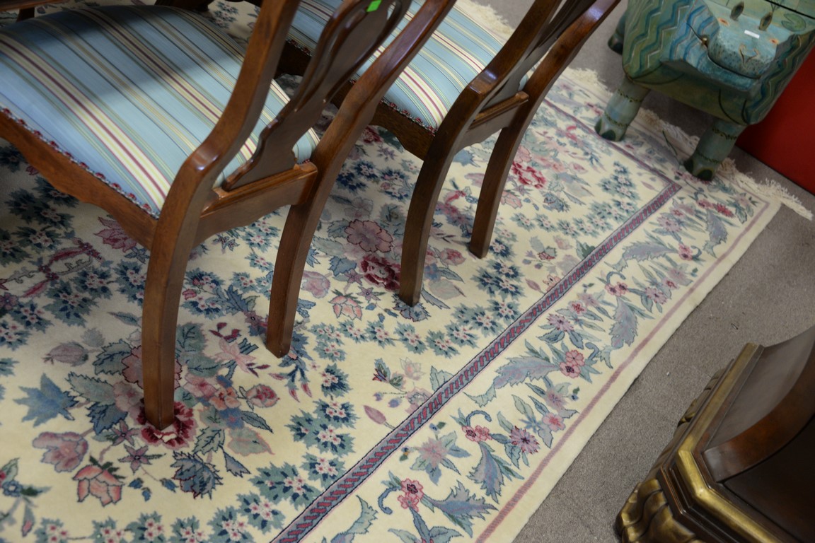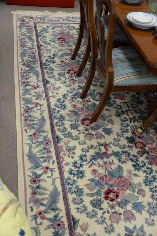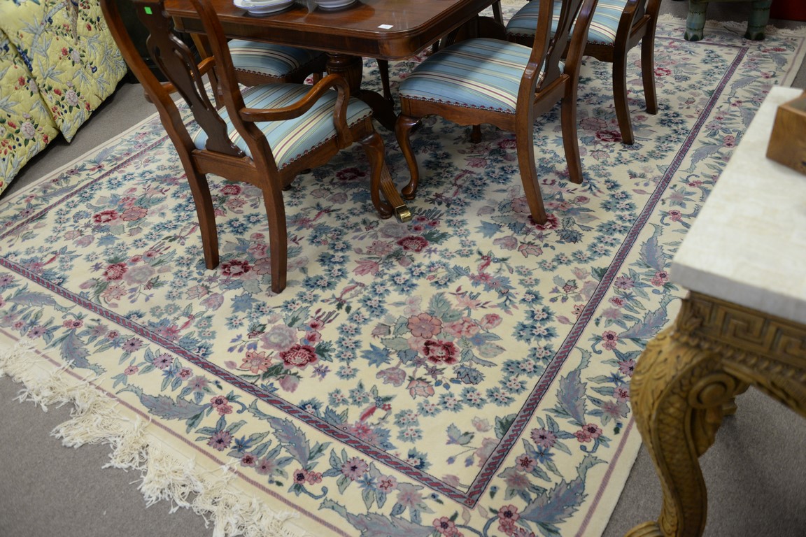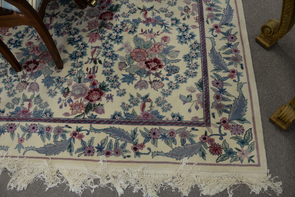 Lot 336: Contemporary Oriental carpet, cream ground with rose, green, and blue scrolling flower and garland design. 9′ x 11’4