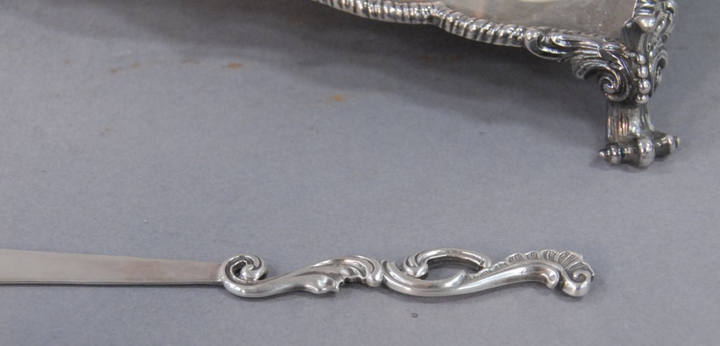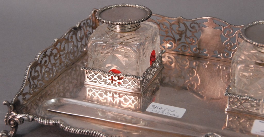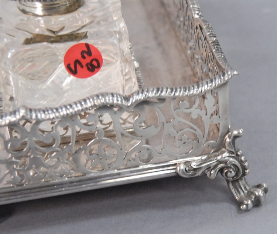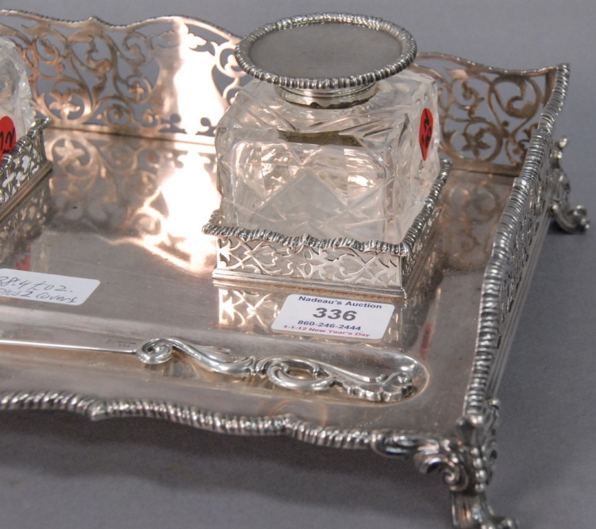 English silver desk set with letter opener and two crystal bottles having silver tops. 38.4 weighable silver plus two silver tops
