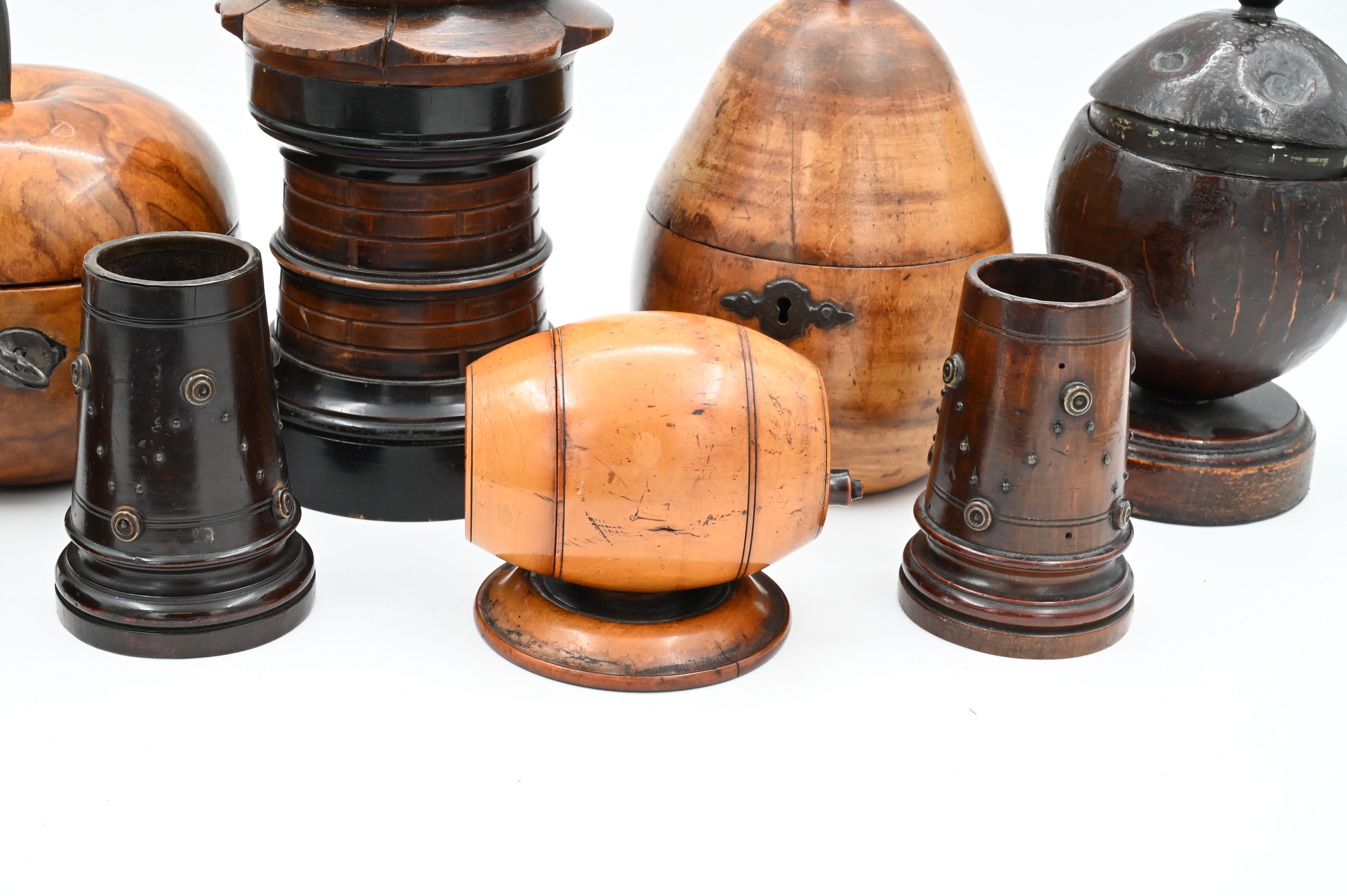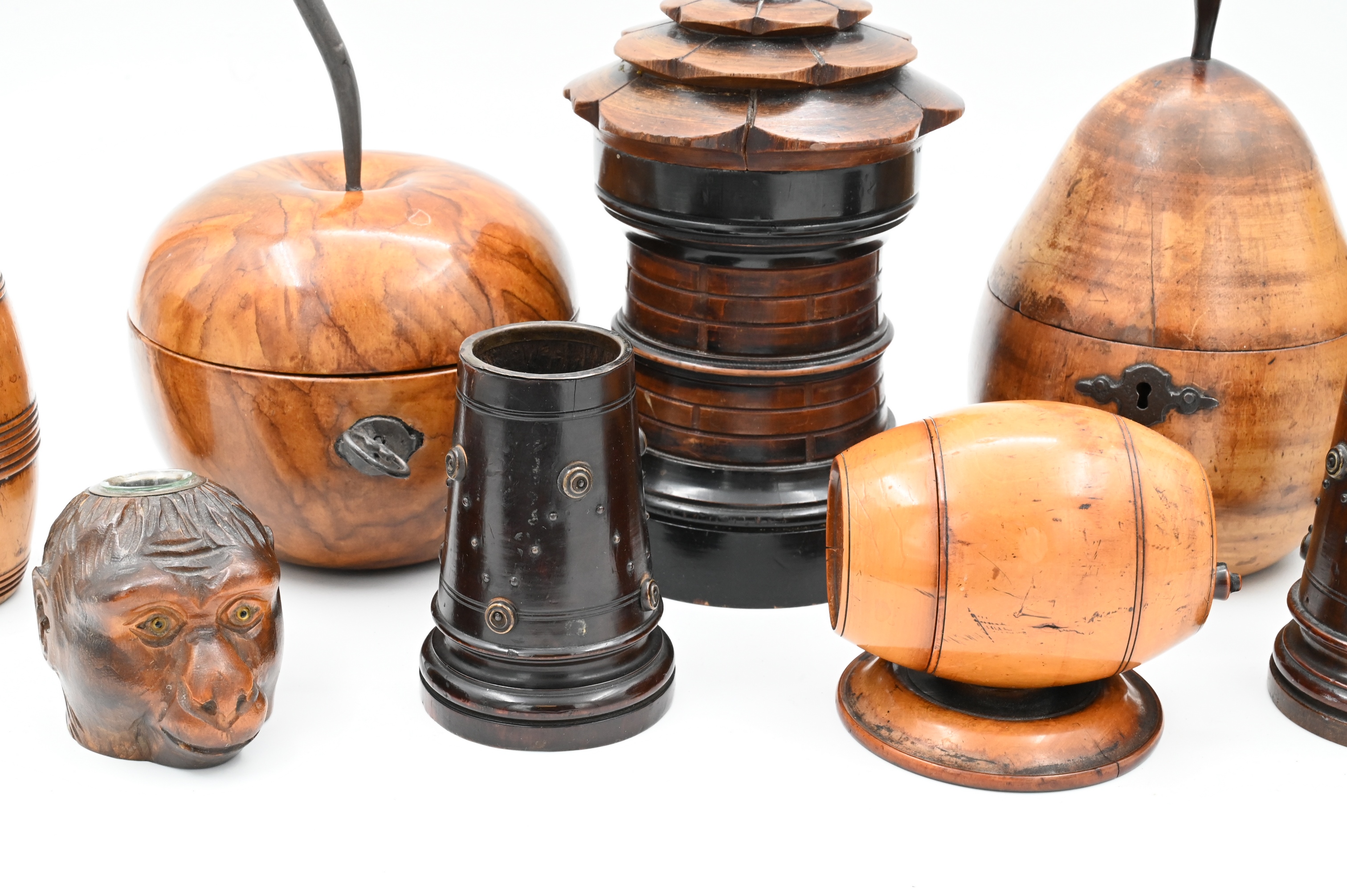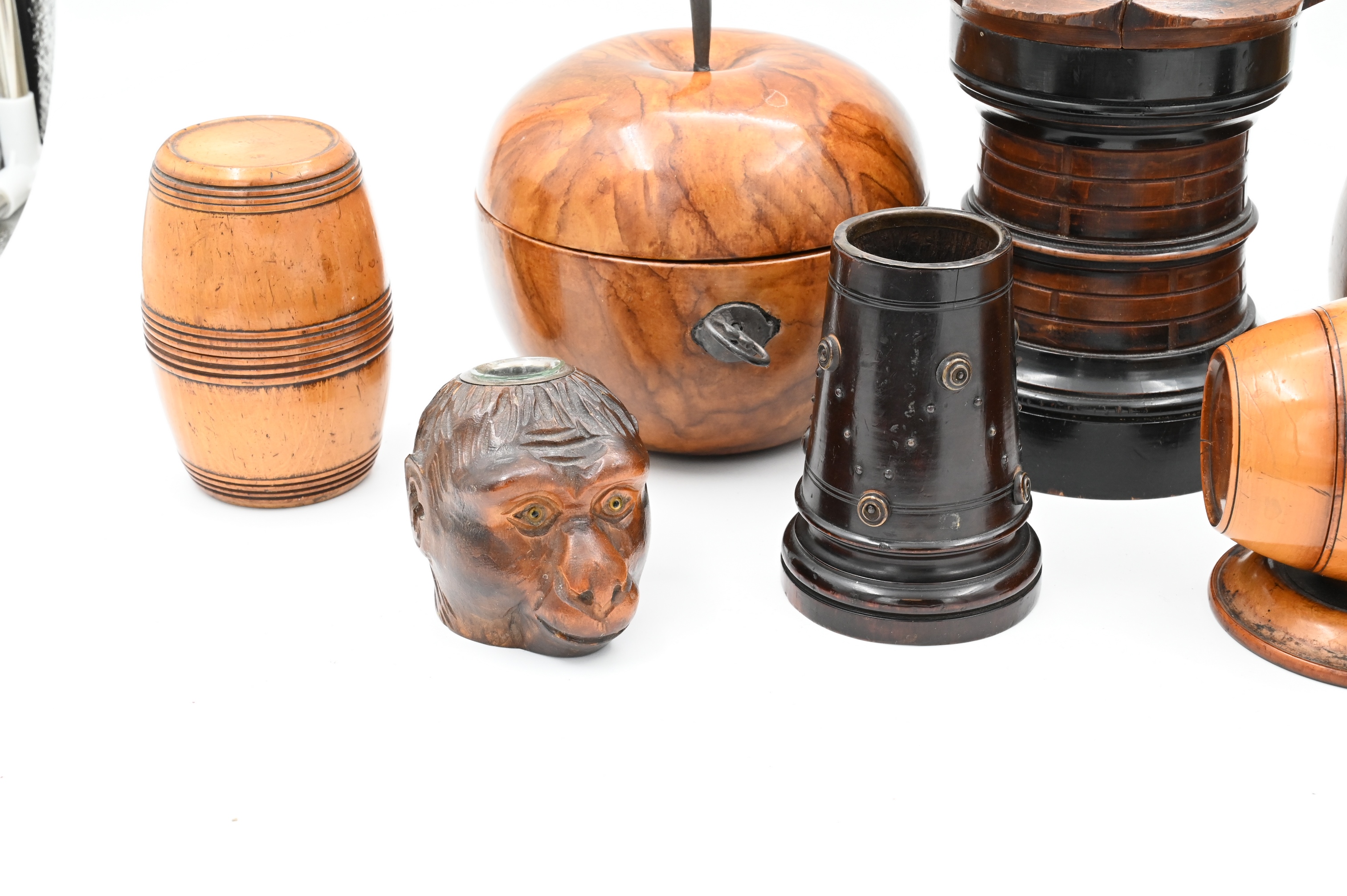 to include monkey inkwell, apple and pear tea box, coconut shell box, two barrel form boxes, and turned cups having metal mounts