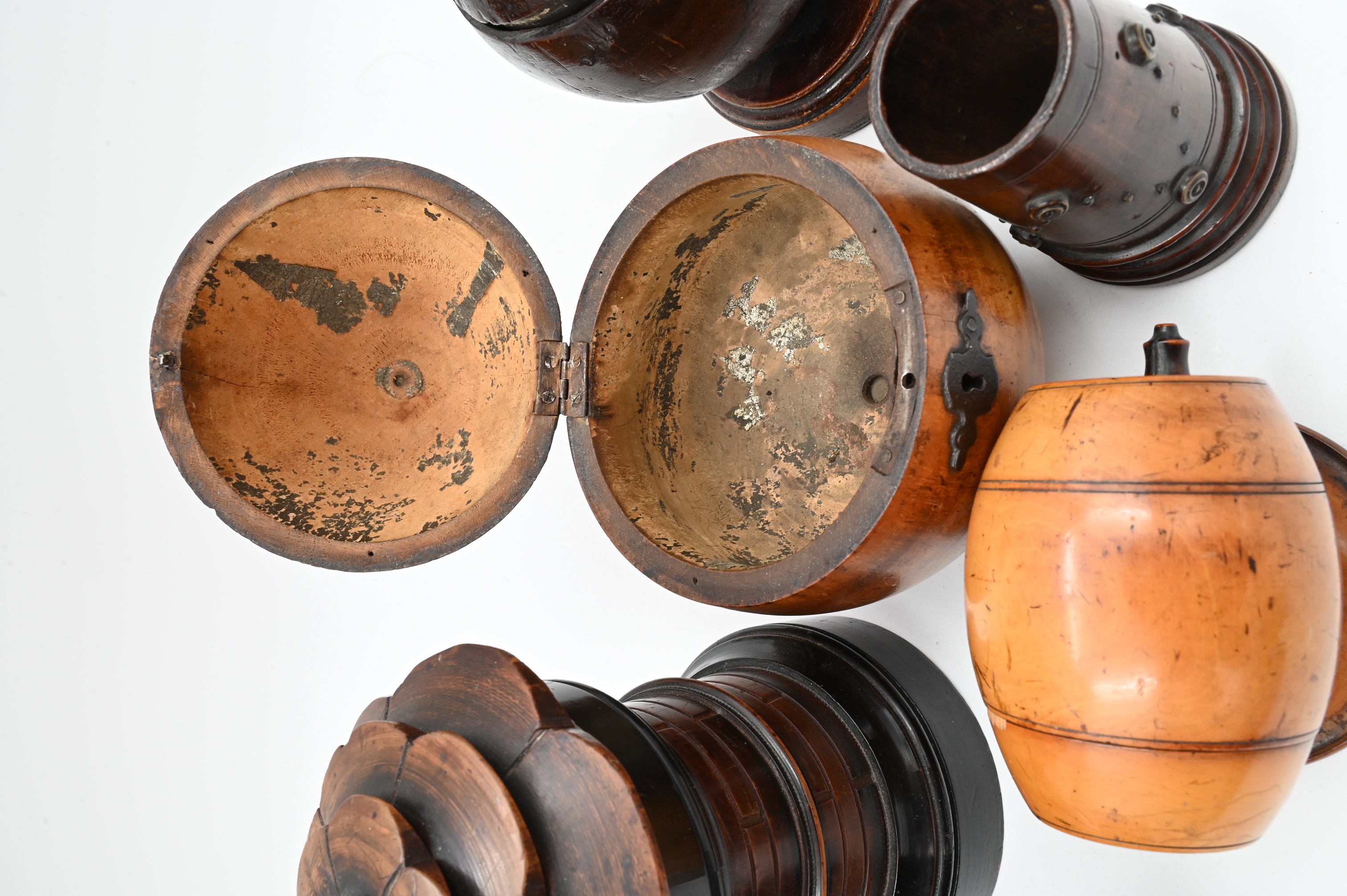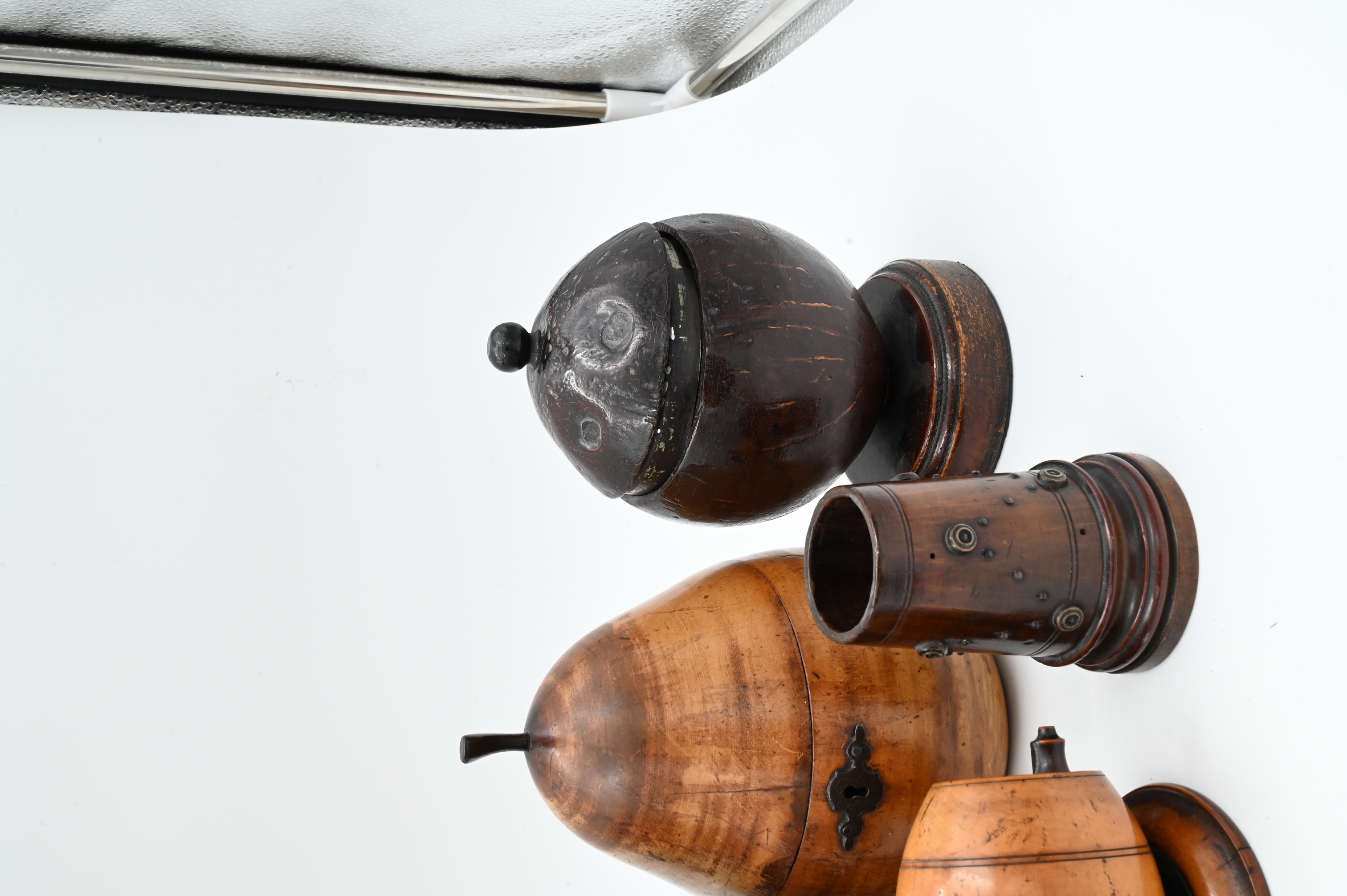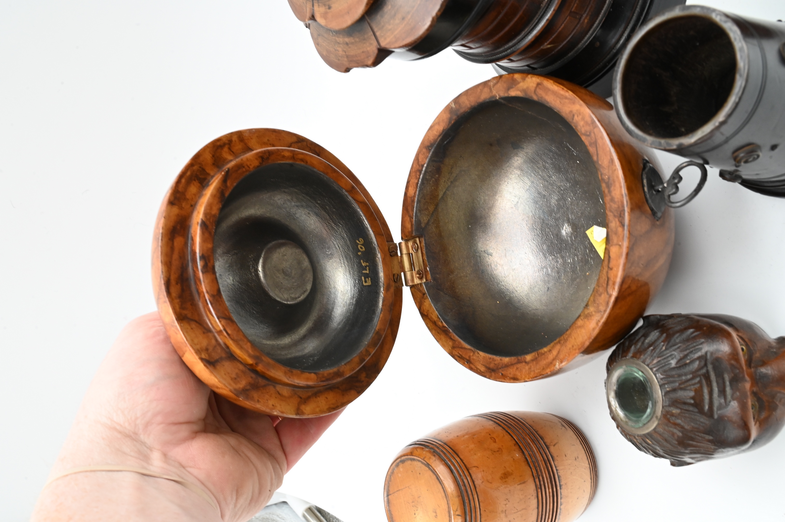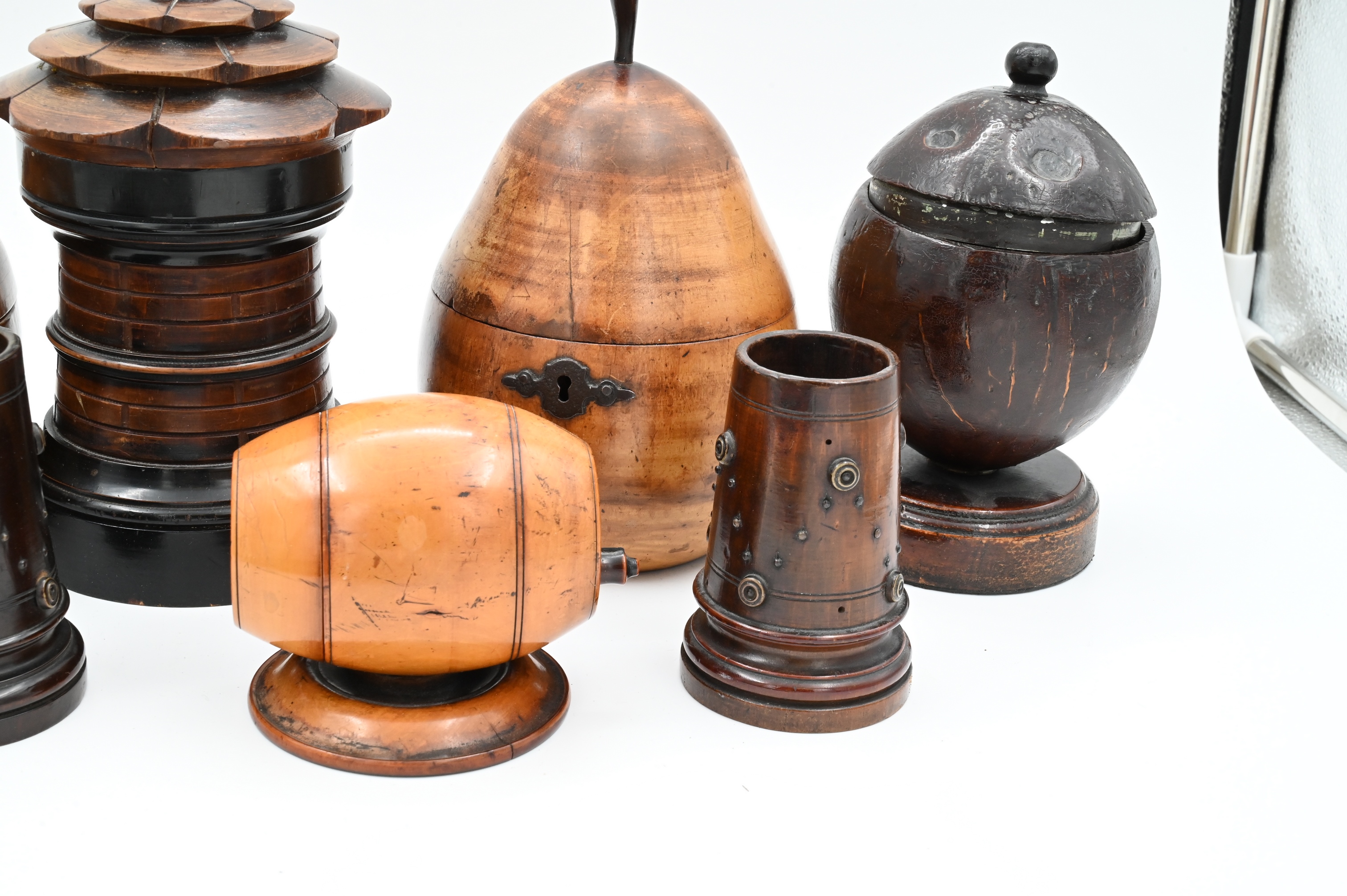 to include monkey inkwell, apple and pear tea box, coconut shell box, two barrel form boxes, and turned cups having metal mounts