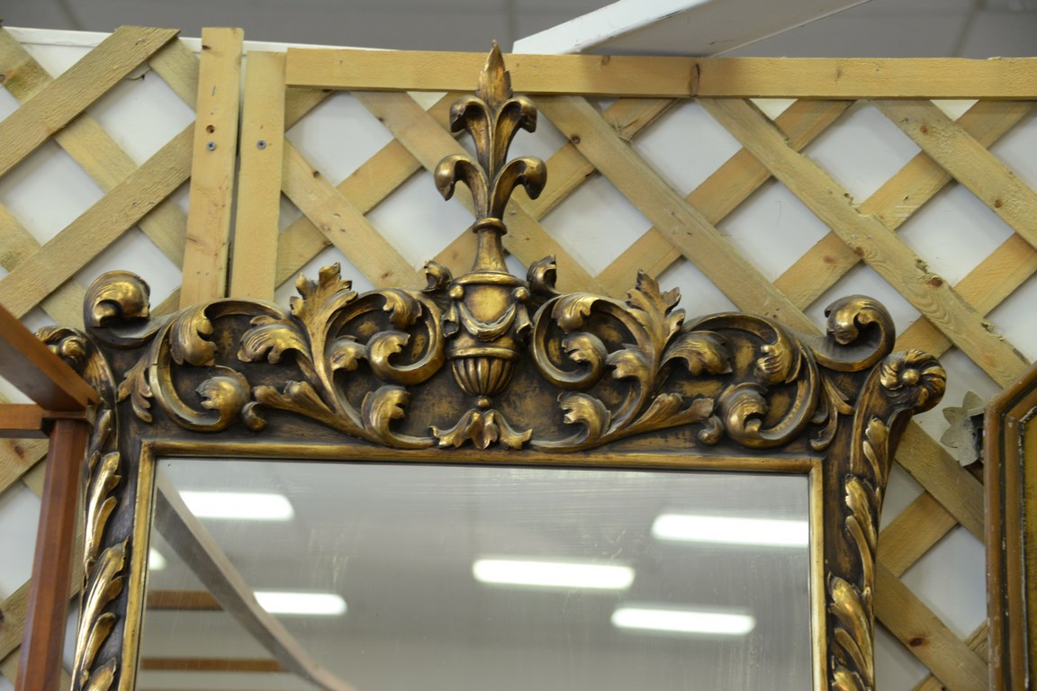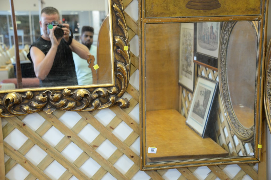 Lot 336: Group of three mirrors including French style gilt framed mirror 46 x 30, two part mirror having painted urn with fruit in top …