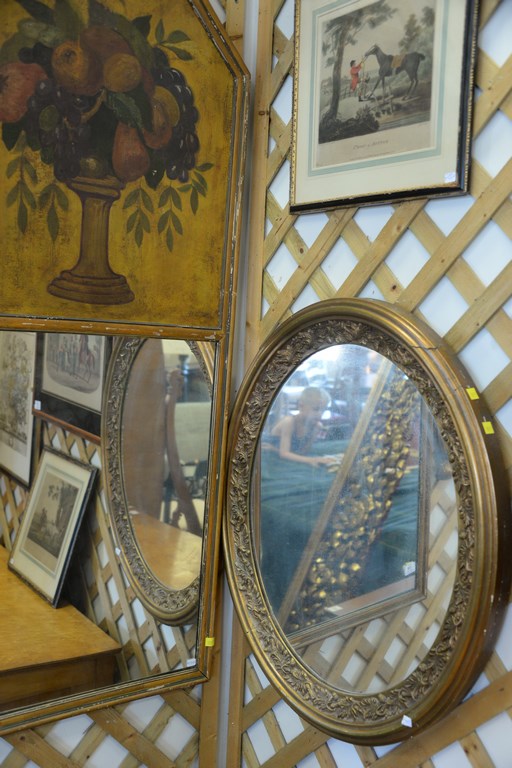 Group of three mirrors including French style gilt framed mirror 46 x 30, two part mirror having painted urn with fruit in top 51 x 23, and an oval mirror 29 x 25.