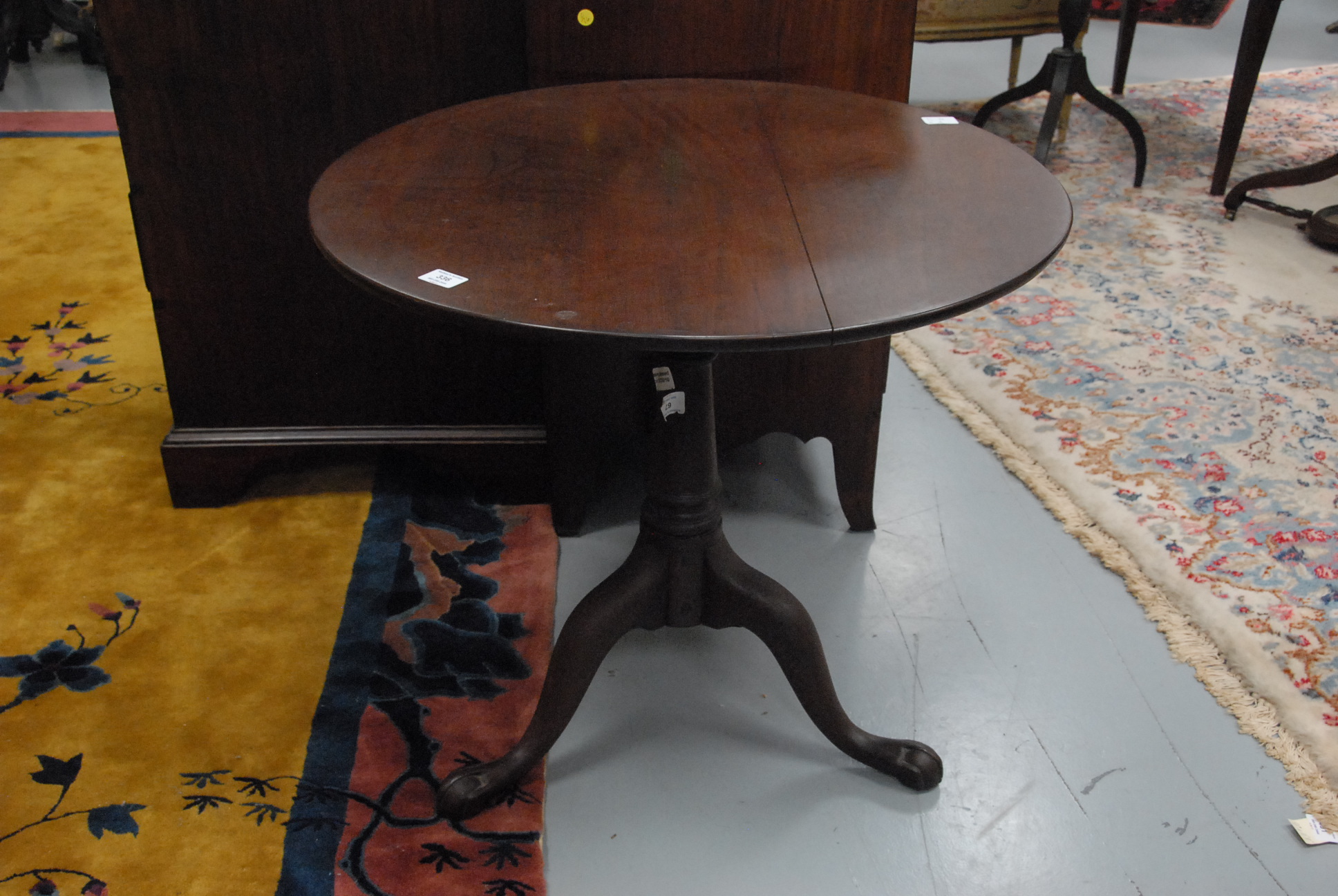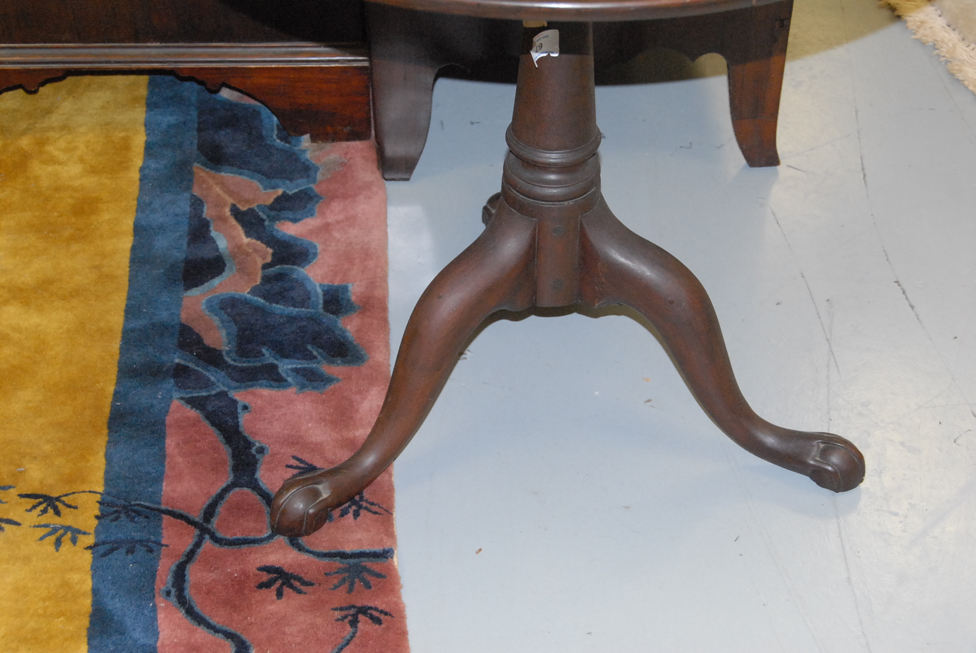 Mahogany tip and turn tea table with birdcage on turned shaft and tripod base ending in ball and claw feet. Provenance: Celeste and Ed Koster, 1964, Estate of Kate Phelps.