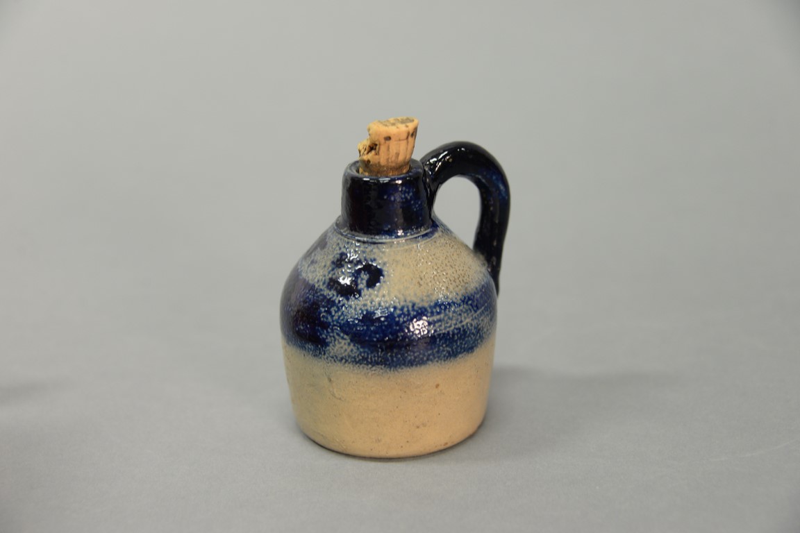 Miniature stoneware jug marked with cobalt blue J.T. and cobalt blue handle. height 3 1/4 inches Provenance: Estate of Dr. Steve Leder