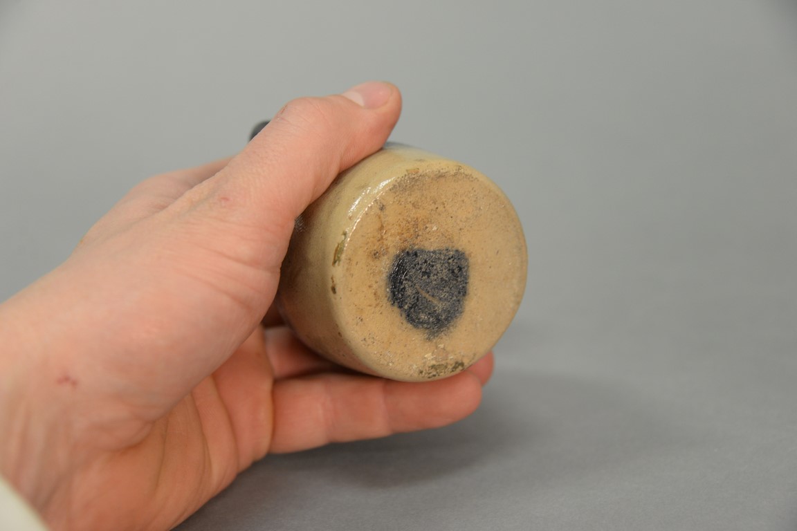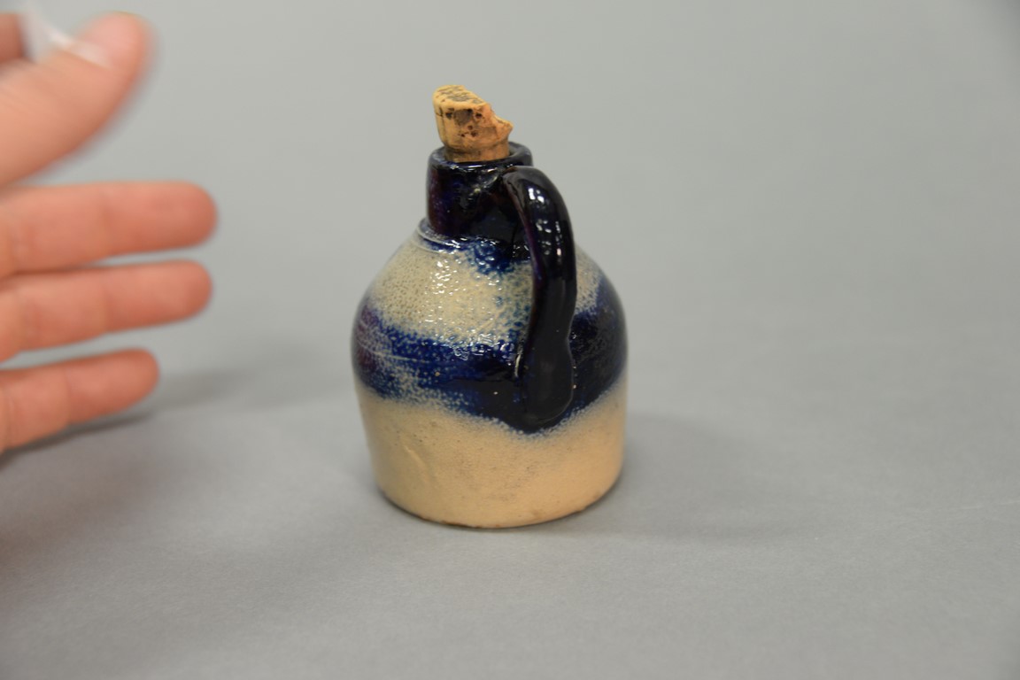 Lot 336: Miniature stoneware jug marked with cobalt blue J.T. and cobalt blue handle. height 3 1/4 inches Provenance: Estate of Dr. Ste…