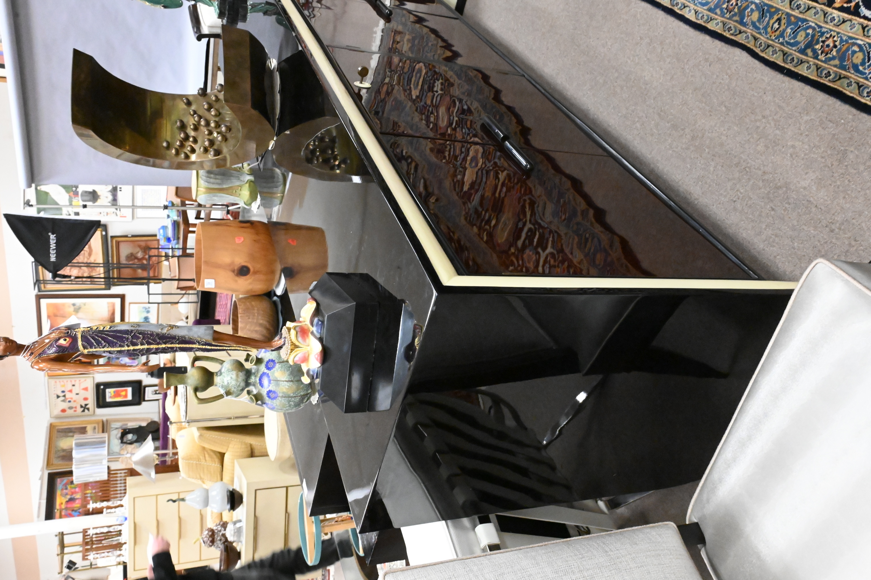 having black lacquer top and sides with interior curved frame in ivory lacquer, front four door panels in Palissandre (rosewood) veneer with cylindrical lacquered door handles and keys, circa 1940-1950’s