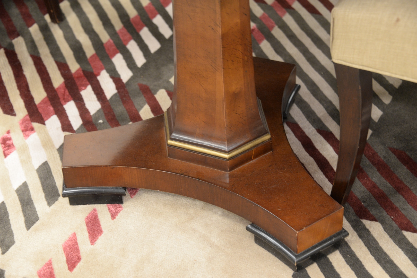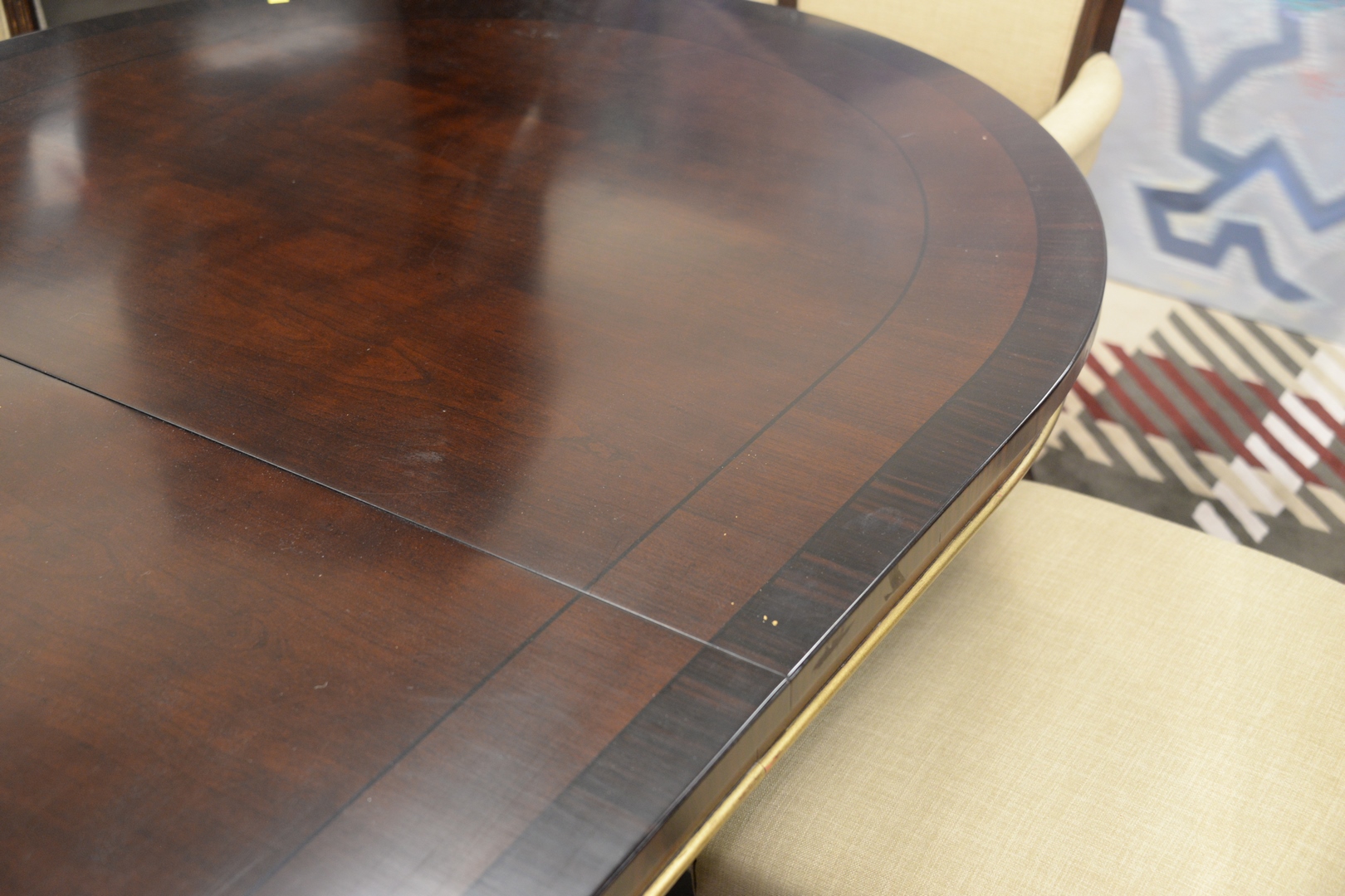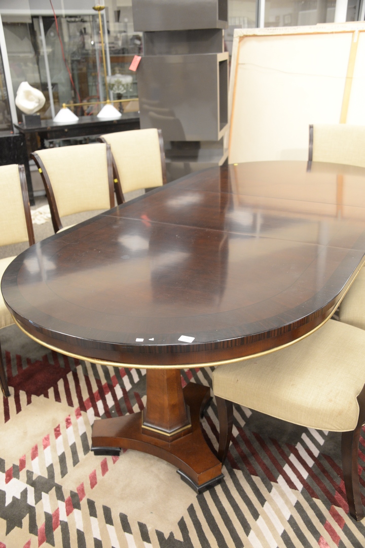 Lot 336: Oval Banded Inlaid Dining Table, possibly Baker, along with one 24″ leaf, height 30 inches, top 48″ x 75″, open 48″ x 97″.