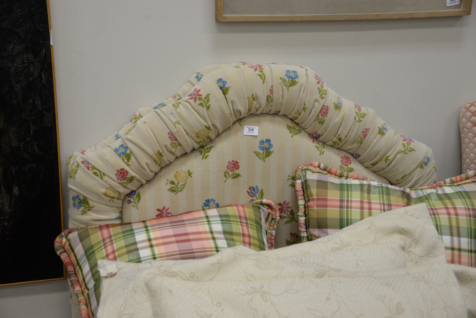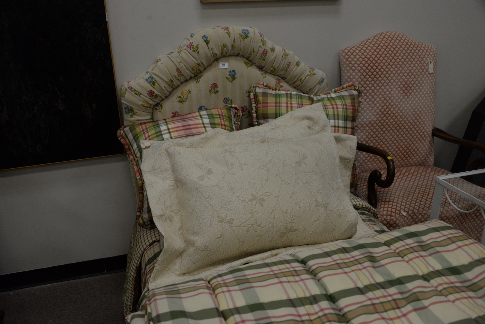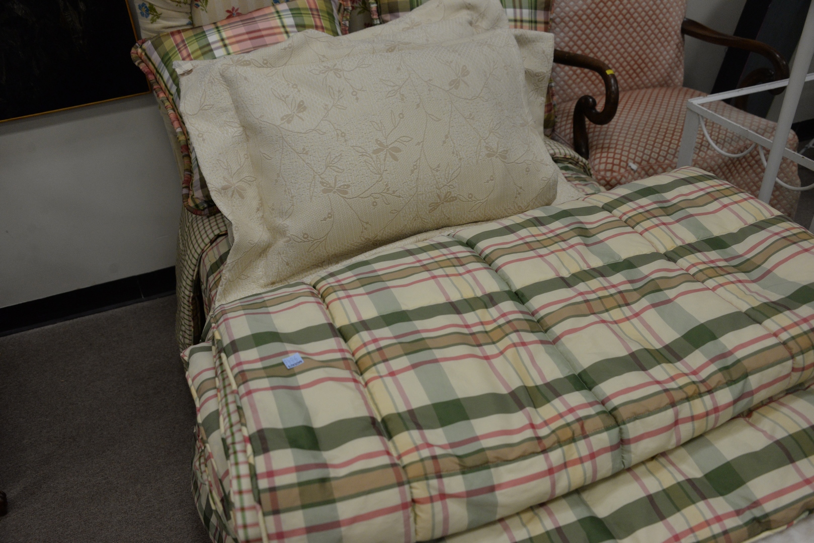 Lot 336: Pair of Twin Beds having custom upholstered headboards having plaid comforters and pillows and tan skirts on Hollywood frames.