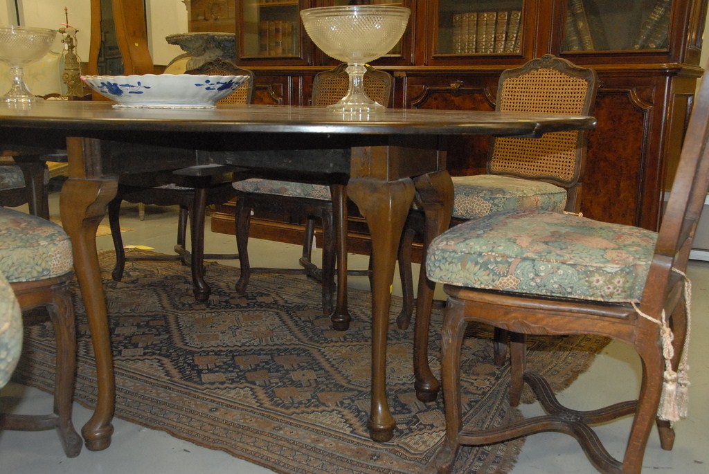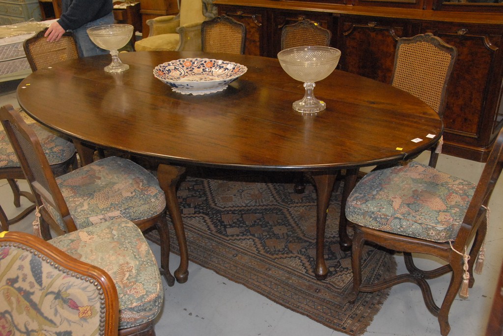 Lot 336: Queen Anne mahogany Irish wake style table, oval top with drop leaves raised on eight cabriole legs four which swing to support lea…