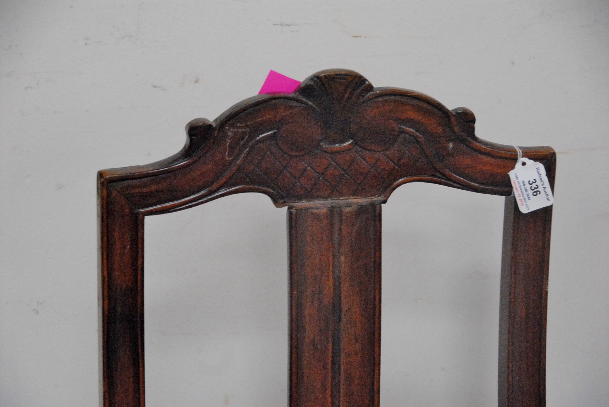 Lot 336: Queen Anne walnut side chair having carved crest rail, un-upholstered plain seat, on cabriole legs ending in pad feet circa 1740 missing two stretchers