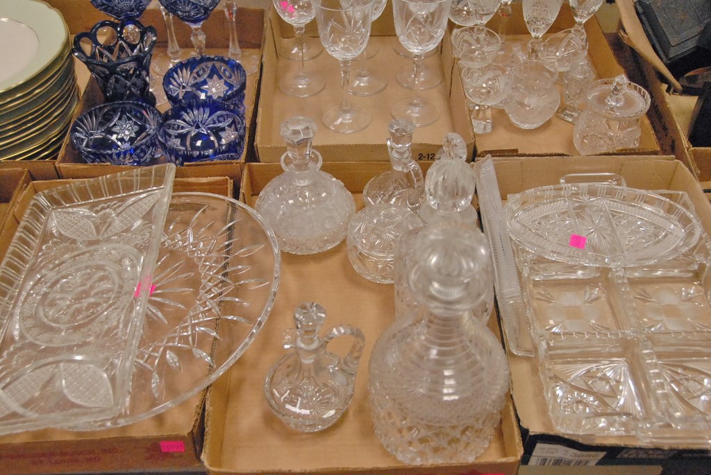 Lot 336: Six box lots of glass and crystal including decanters, cobalt to clear stems and bowls, and serving dishes.