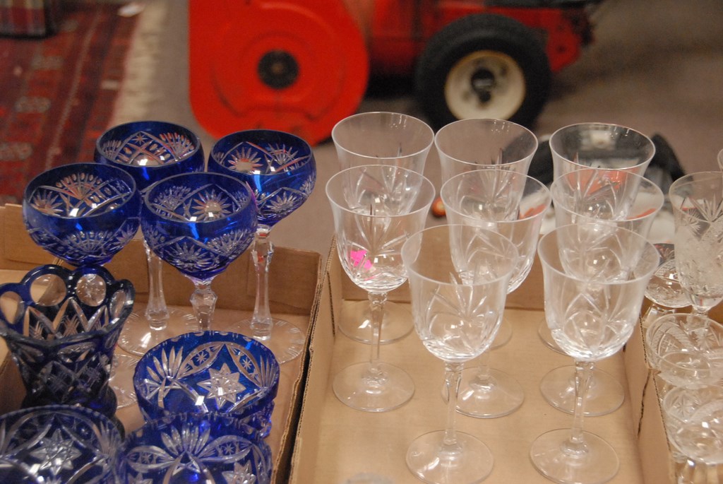 Six box lots of glass and crystal including decanters, cobalt to clear stems and bowls, and serving dishes.