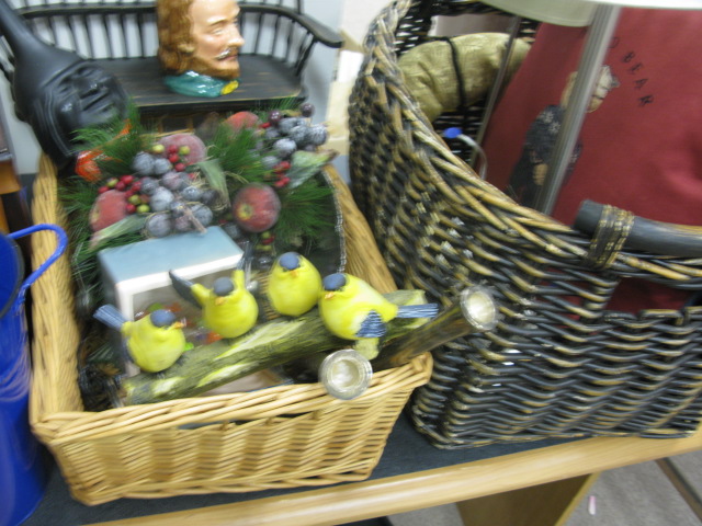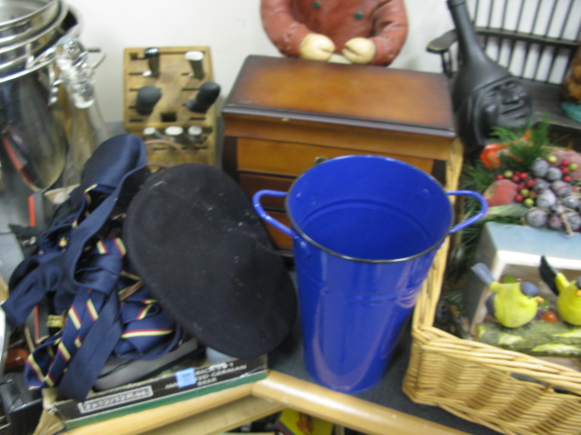 Table lot to include pots and pans, baskets, knives, jewel box, artificial plants, three boxes of books and miscellaneous items