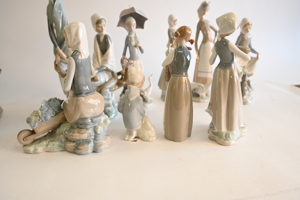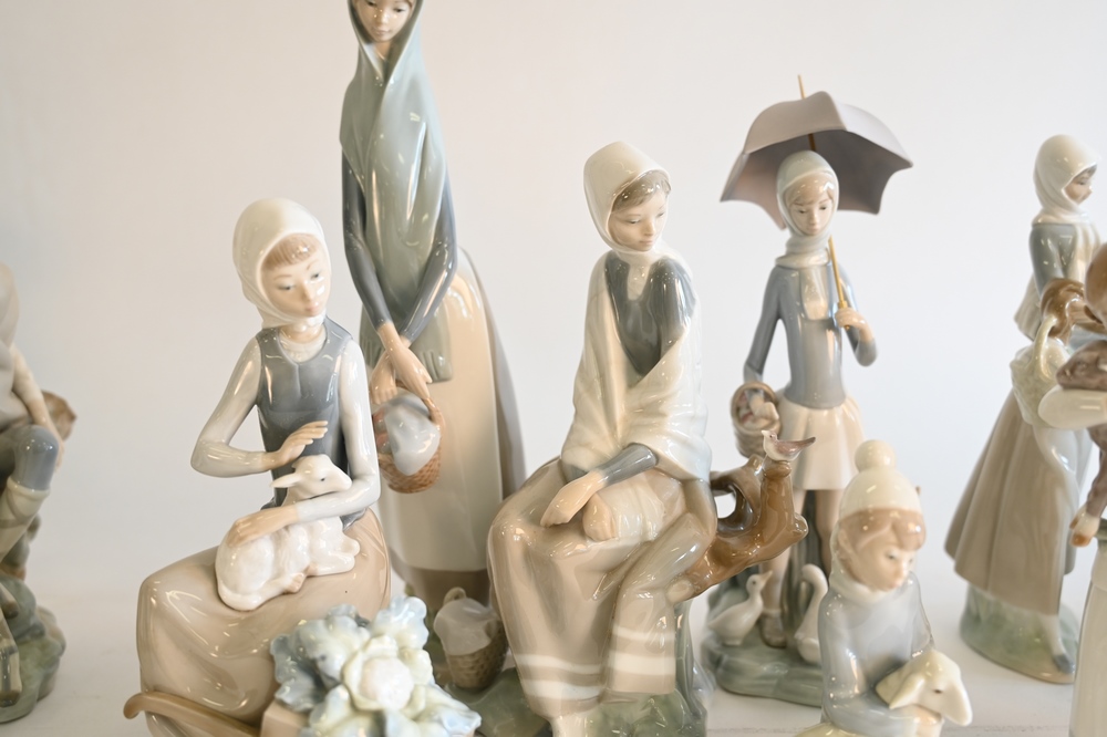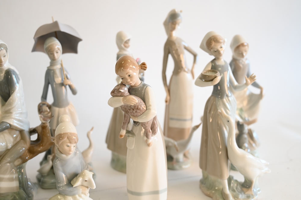 Lot 336: Ten Piece Lot of Porcelain Lladro Figures of Girls with Animals, to include “Aldeana Con Gallo”, “Comida Para El Conejo”, “Nina Corderito”, “Pastorcito Cordero Belen”, along with several others, each accompanied by original box, tallest height 13 inches.