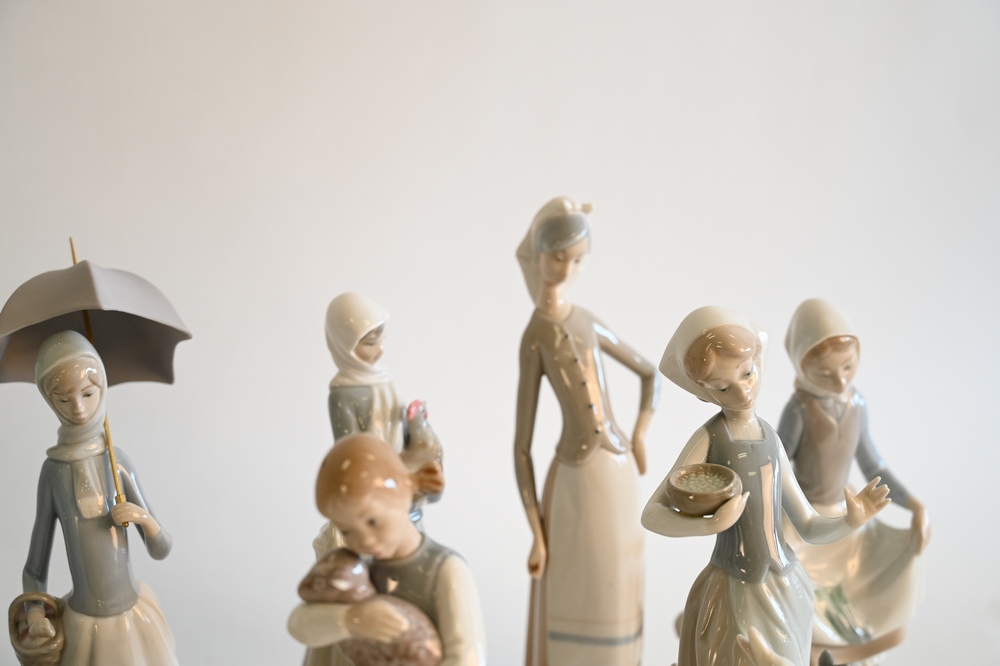 Ten Piece Lot of Porcelain Lladro Figures of Girls with Animals, to include “Aldeana Con Gallo”, “Comida Para El Conejo”, “Nina Cord…