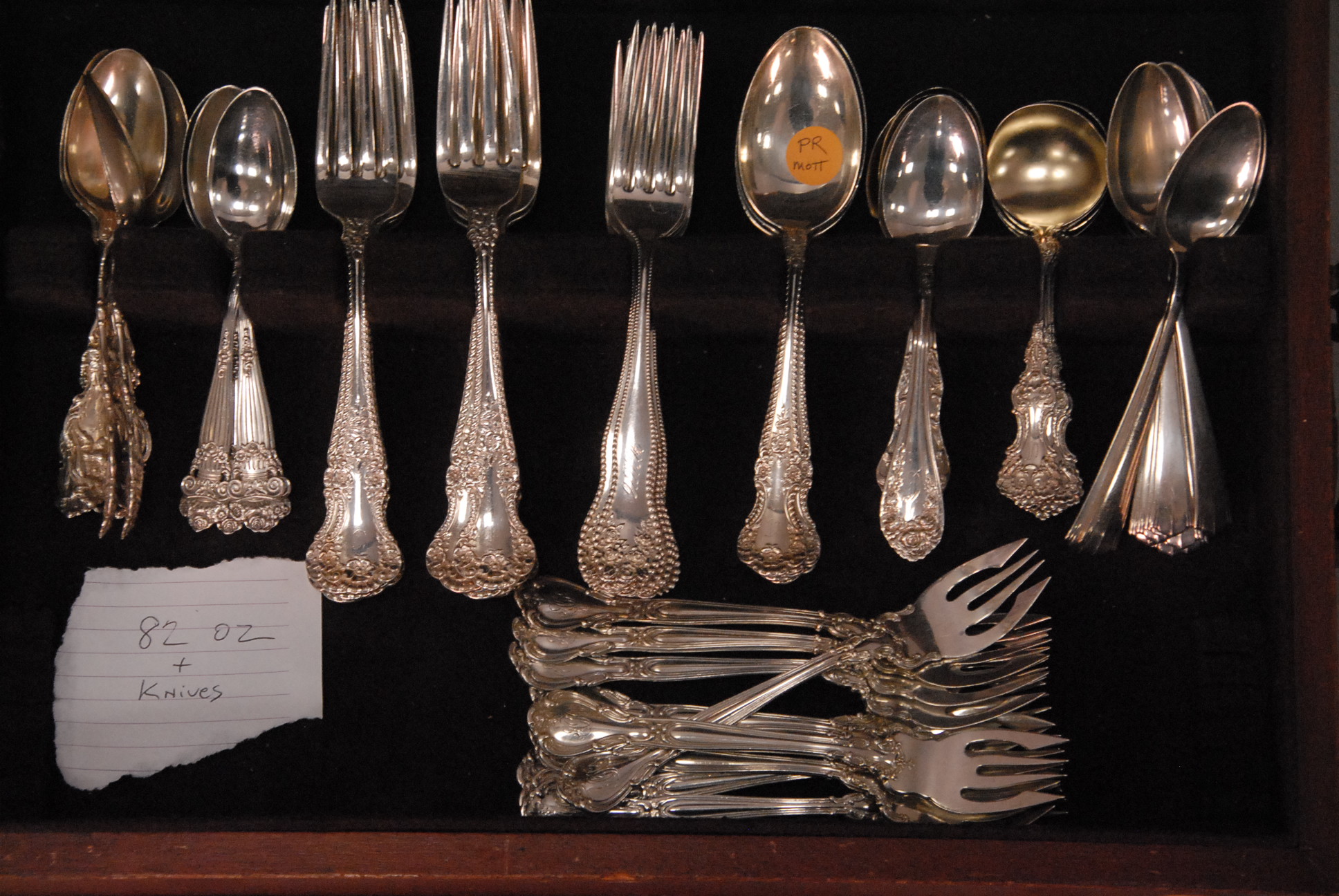 Sterling silver spoons and forks, nine patters. 82.0 troy oz. plus 12 handles.