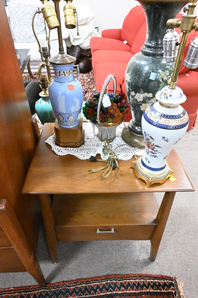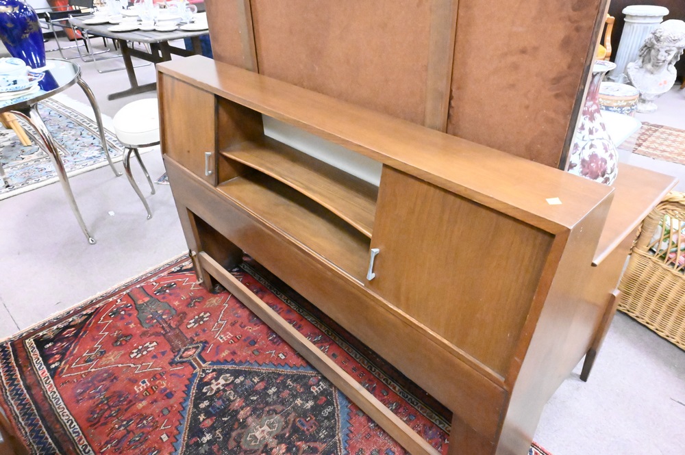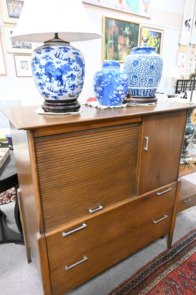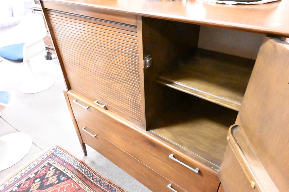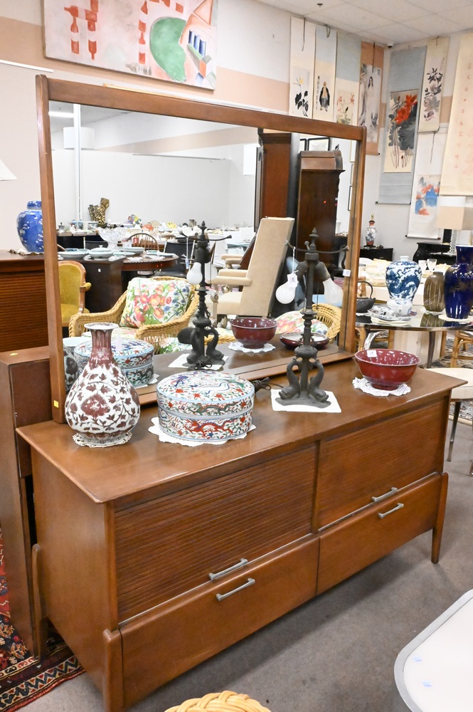 Lot 337: 1970 Heywood Wakefield Five Piece Set, to include a long dresser, mirror, bed, tall chest, and stand, height 68 inches, width 60 inches.