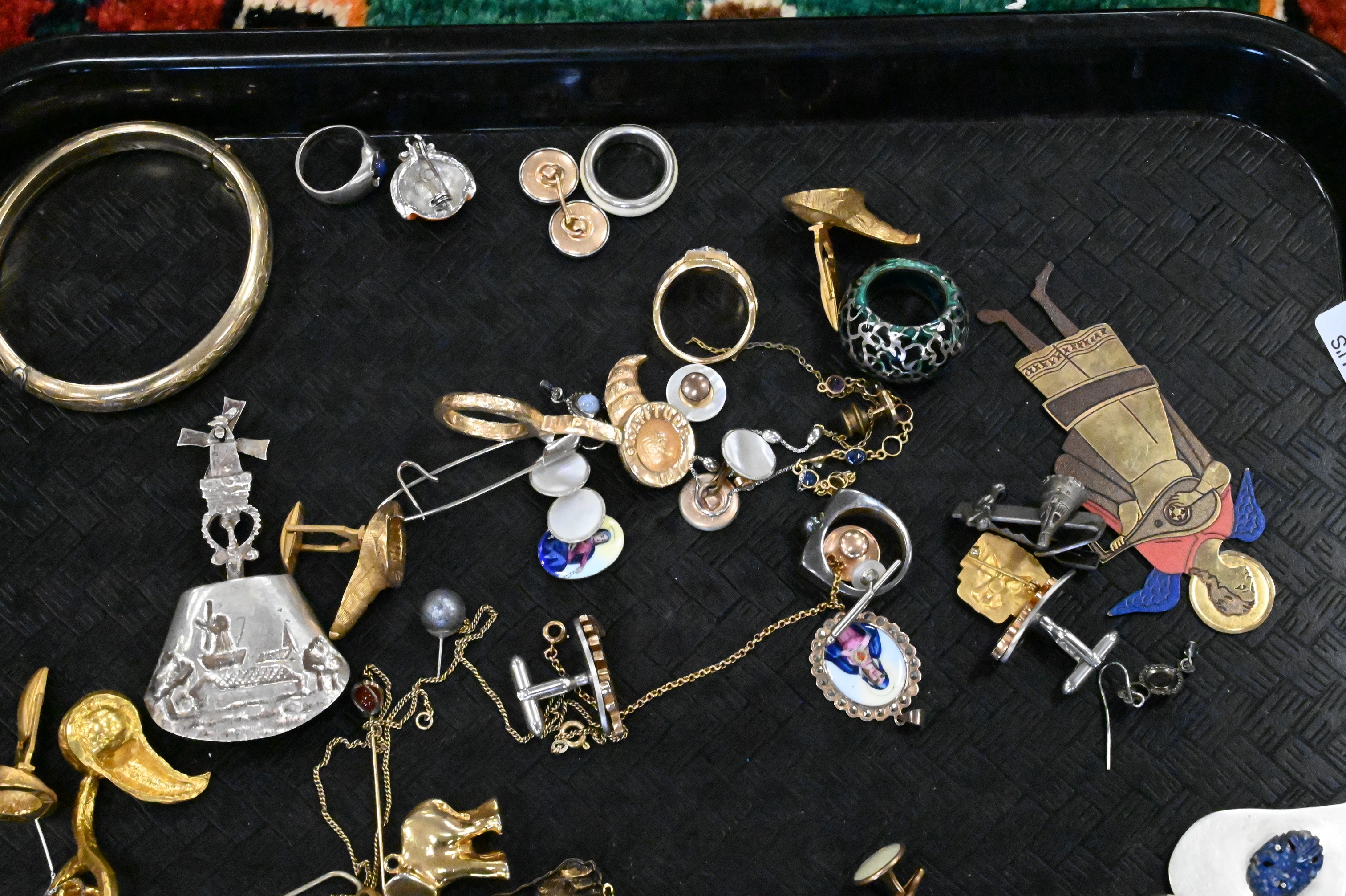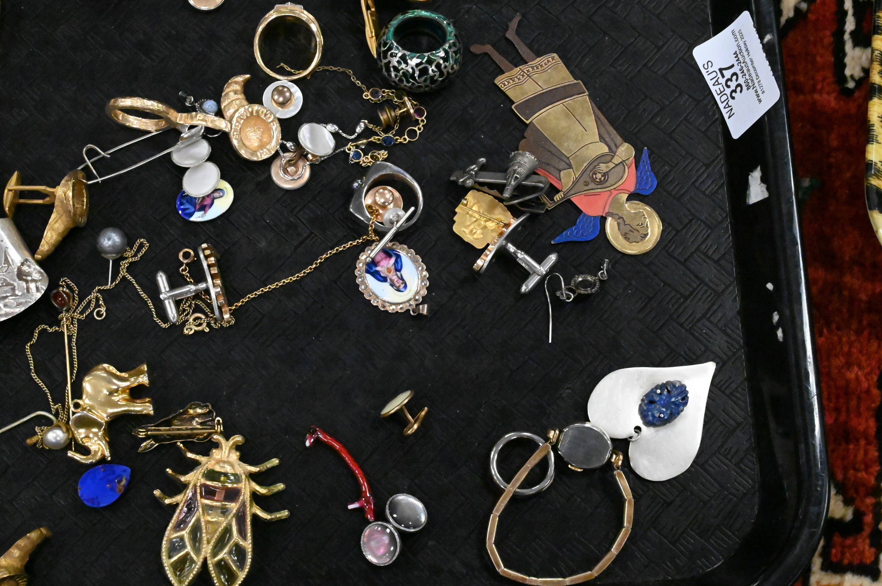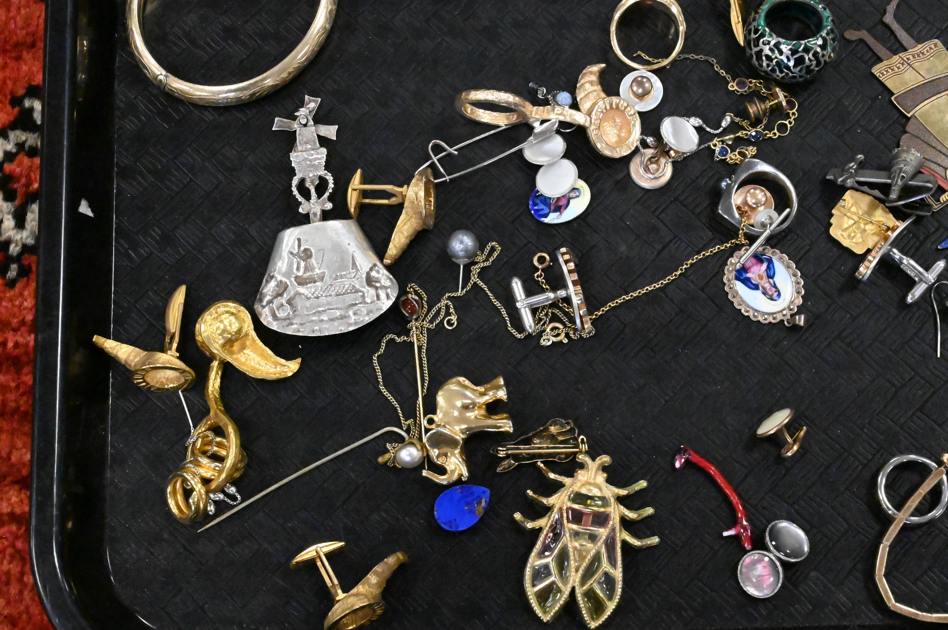 Including a Tiffany & Co. 8-day 15-jewel travel clock; several pocket watches marked Waltham, Elgin, and Illinois Watch Co.; turquoise and coral bead necklaces; carved bone, jade, and tortoiseshell-style bangles; assorted rings and pendants, some set with turquoise, malachite, and other stones; a Swedish medal with blue and yellow ribbon; carved amber bead; and miscellaneous gold-tone and silver-tone jewelry components, watch chains, and accessories.