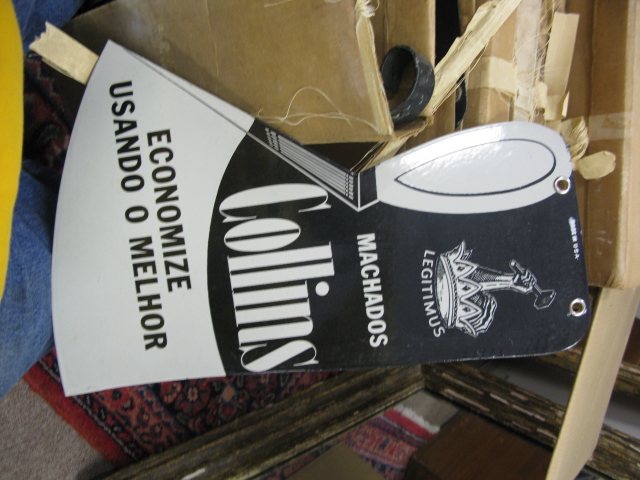 Box lot of 8 Collinsville Axe Company original signs in Spanish with mounting brackets to hang them.