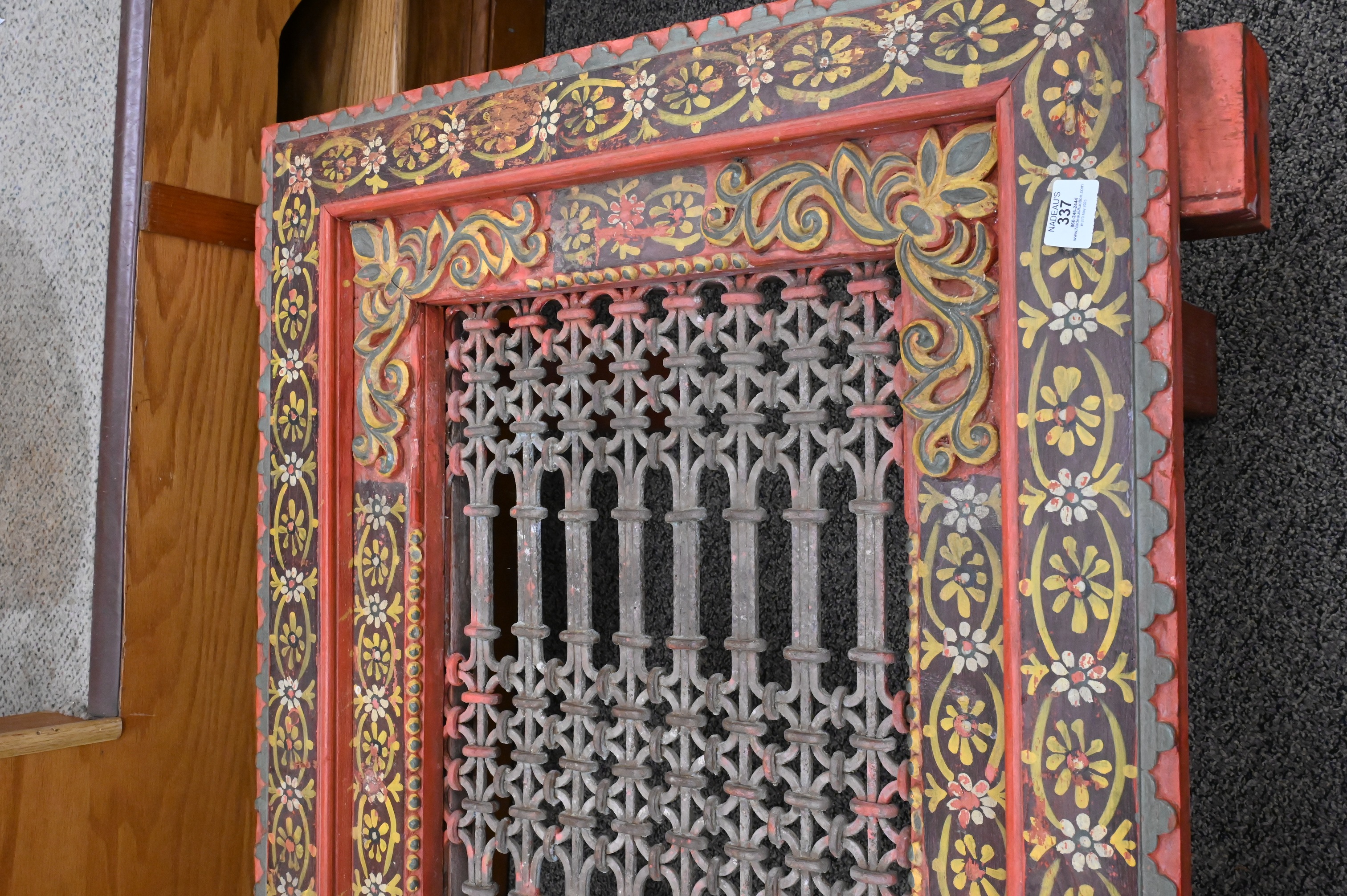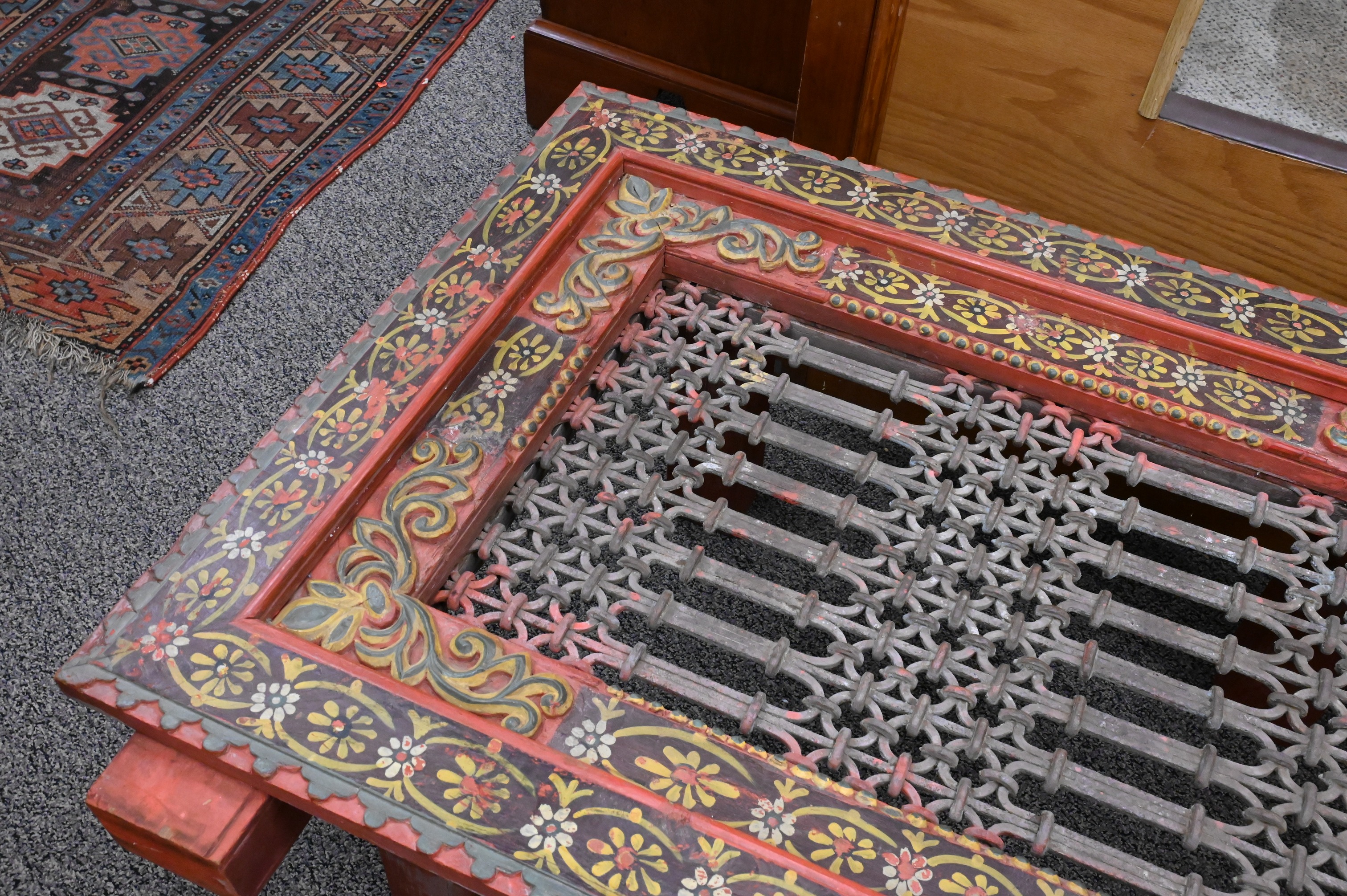 red painted with yellow and green floral accents centered by openwork top