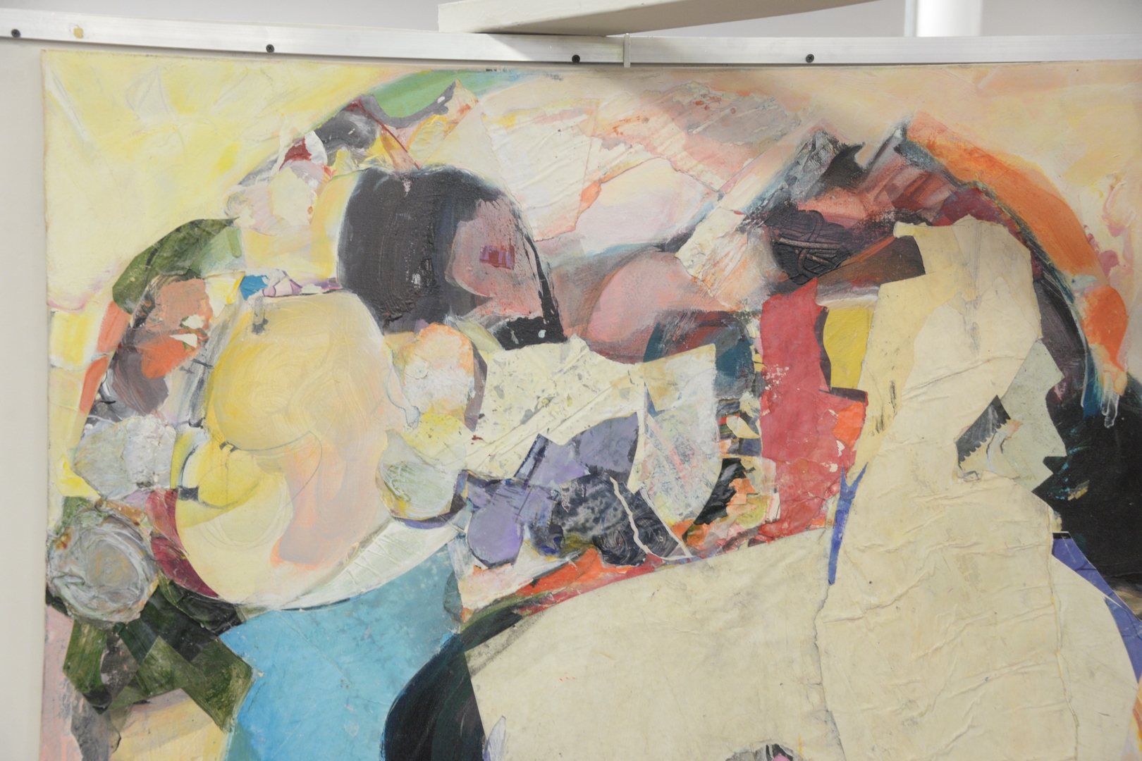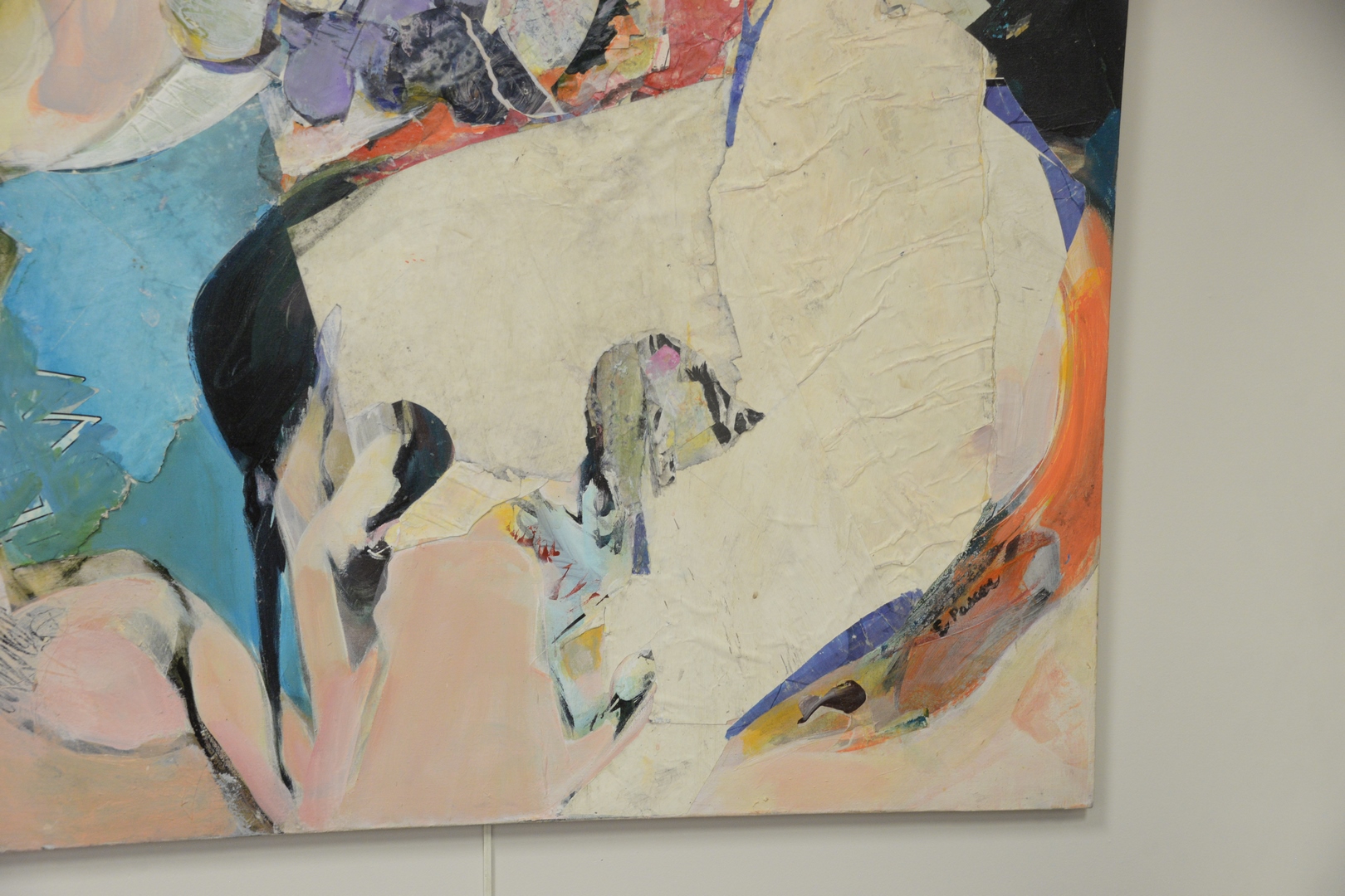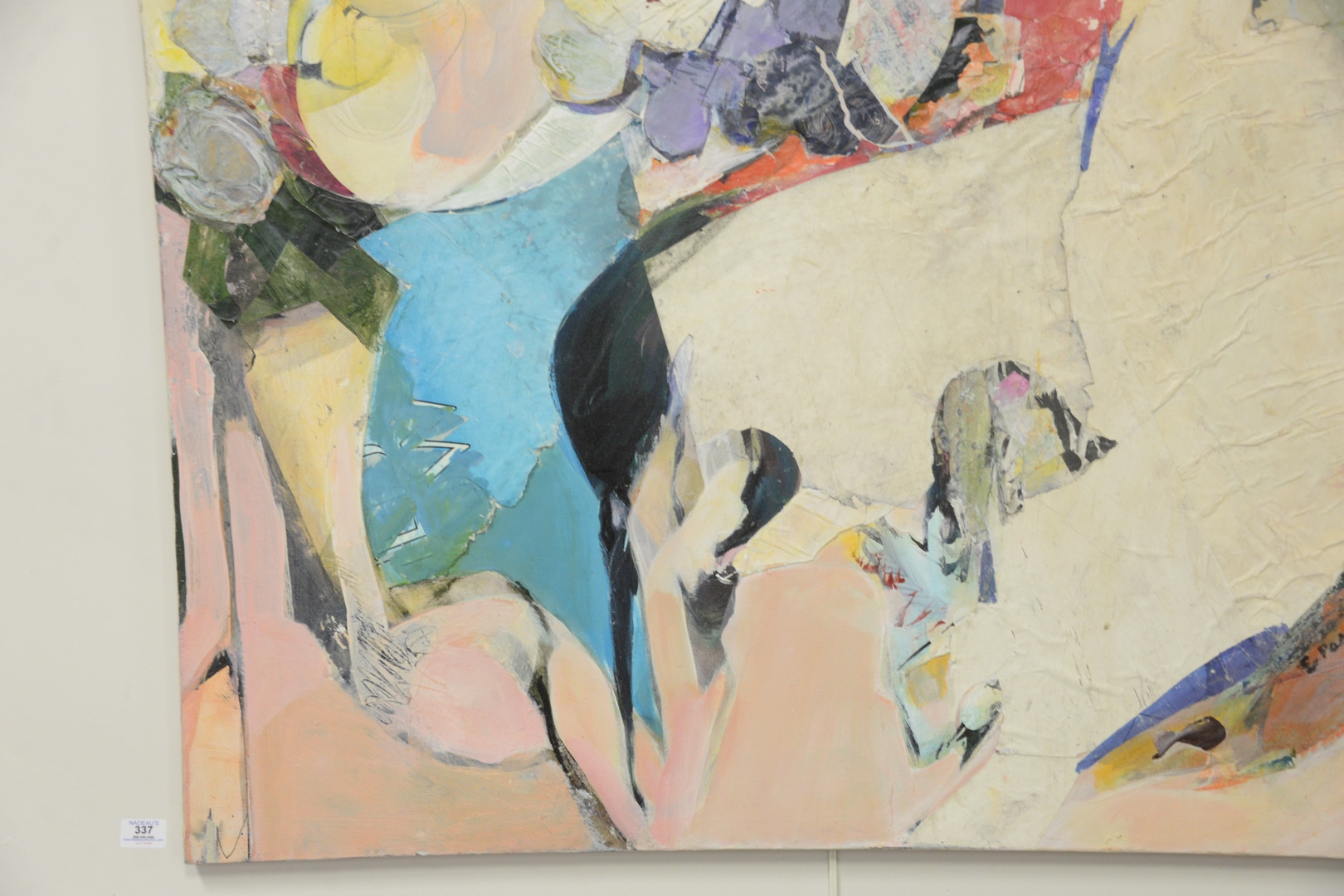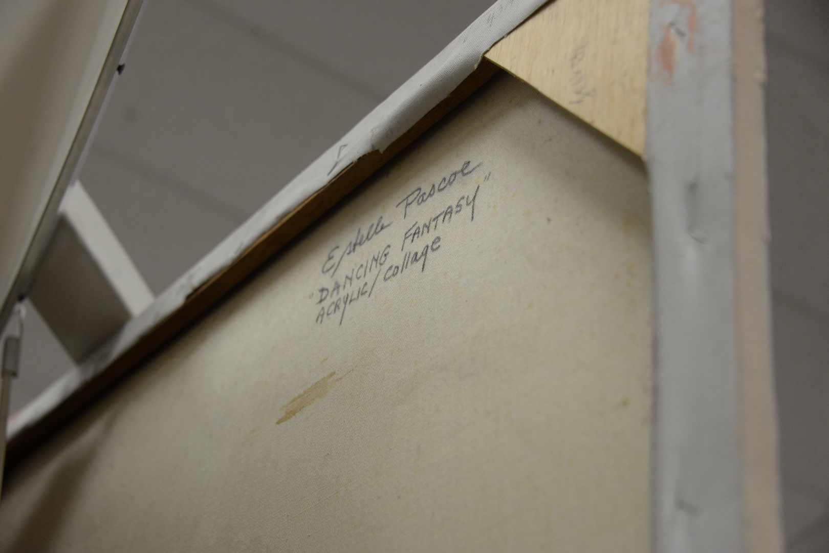 Lot 337: Estelle Pascoe (American, 1928 – 2007), Dancing Fantasy, acrylic and collage oil on canvas, signed, titled, and inscribed on the reverse, unframed, 43 1/4″ x 43 1/4″.