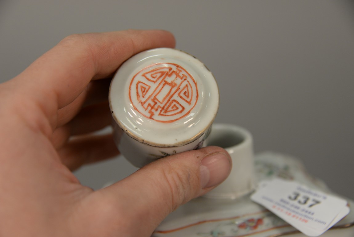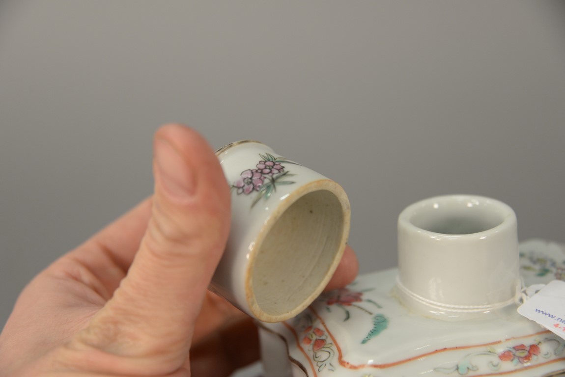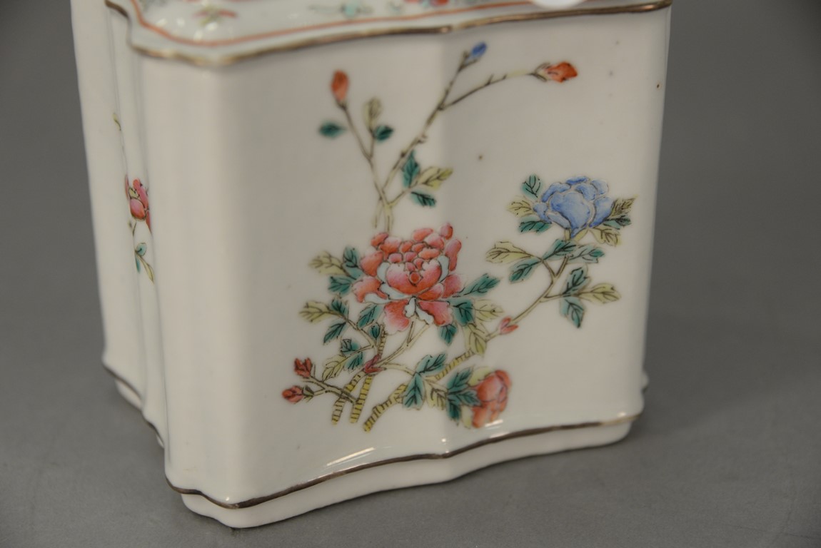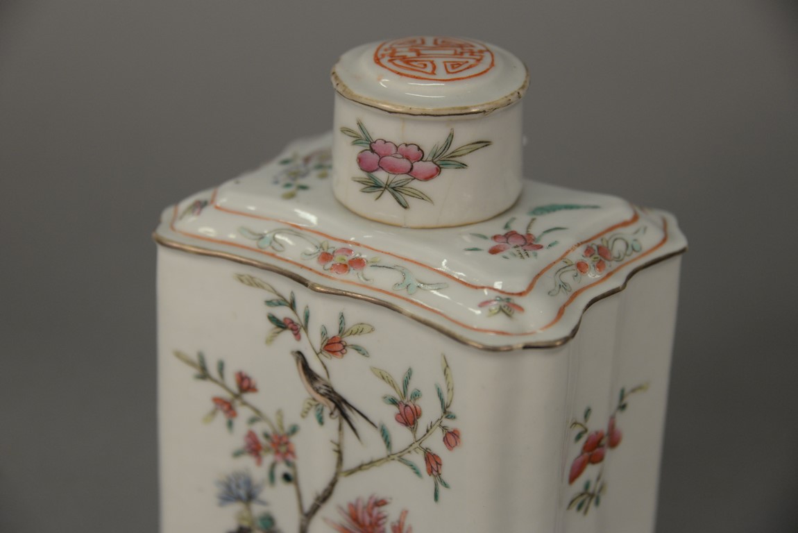 Lot 337: Famille Rose porcelain tea jar having blossoming wild flowers and birds. ht. 6 in. wd. 4 1/2 in.