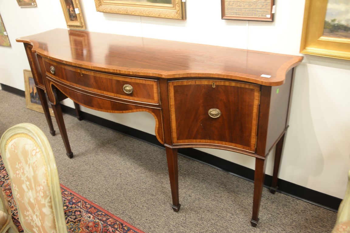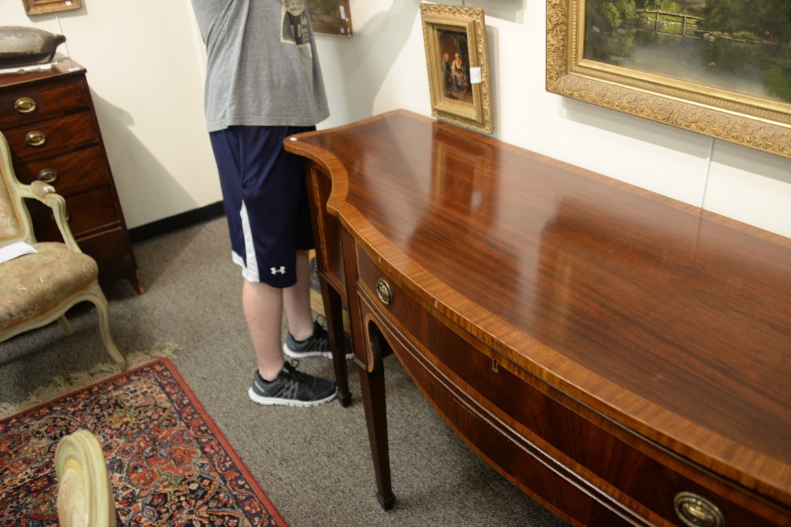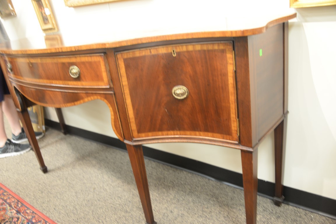 Lot 337: George IV style mahogany sideboard with banded inlays surface imperfections. ht. 37in., top: 24 x 84