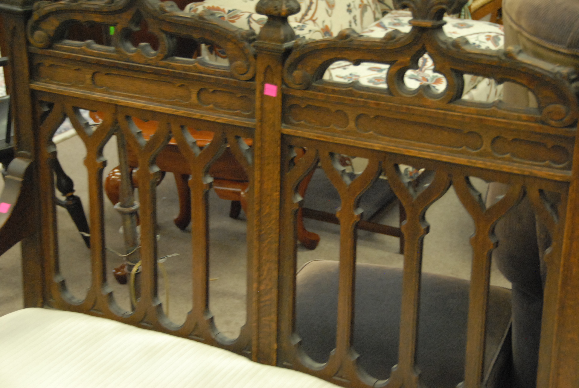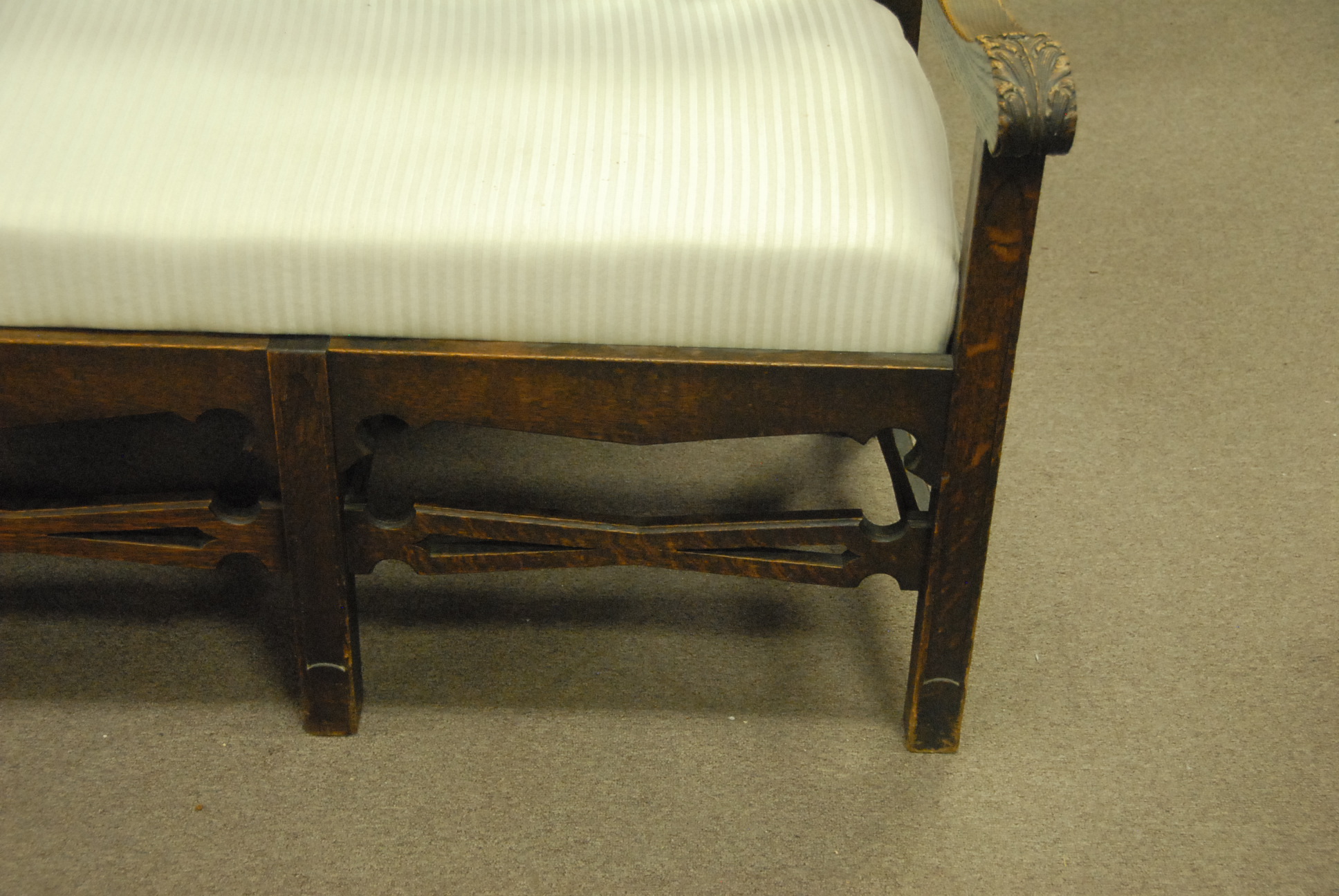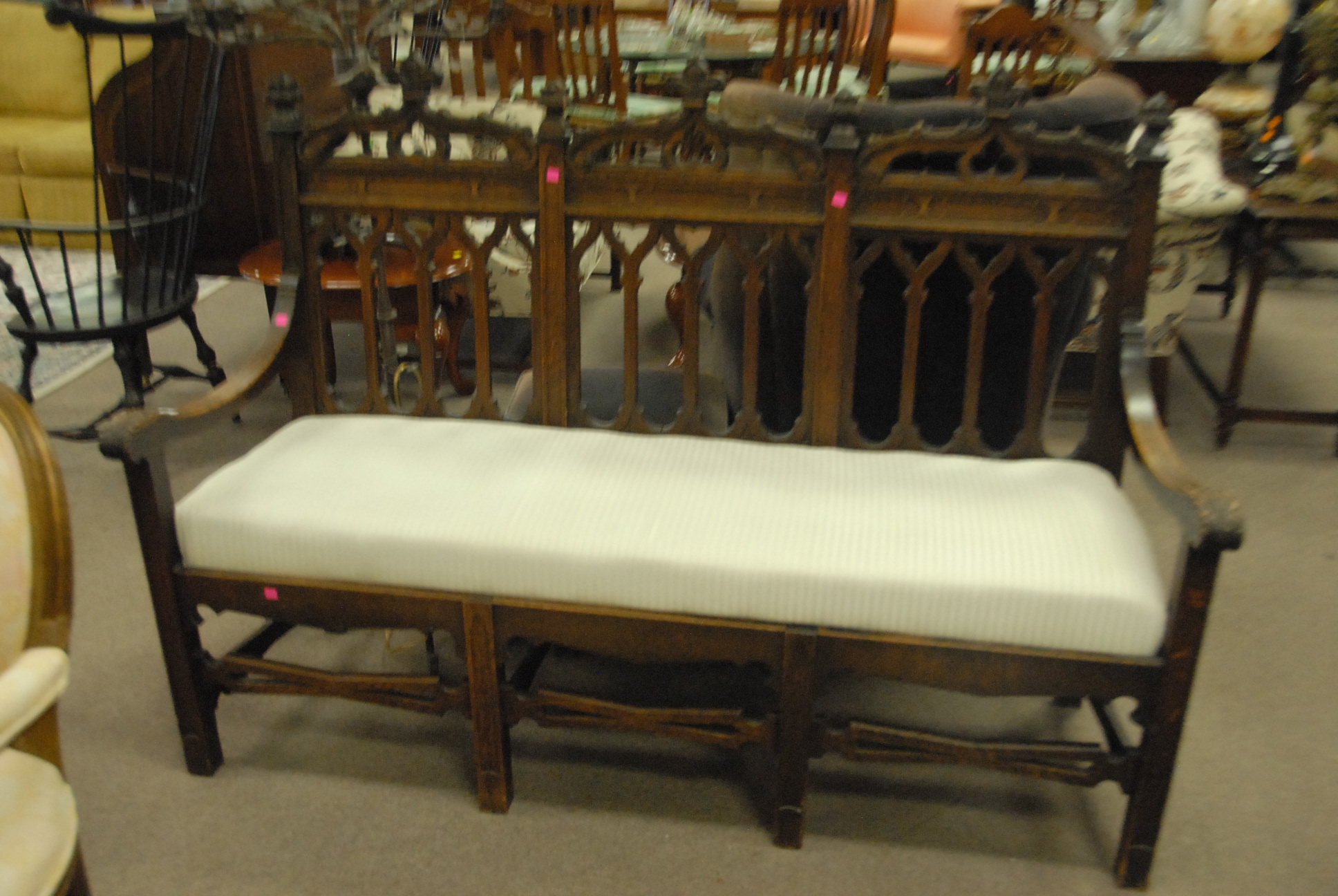 Gothic oak settee, three seat with upholstered seat, ht. 45in. lg. 64in.