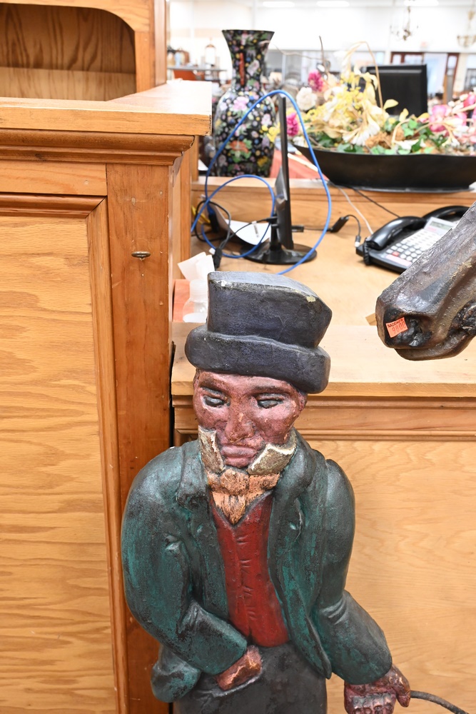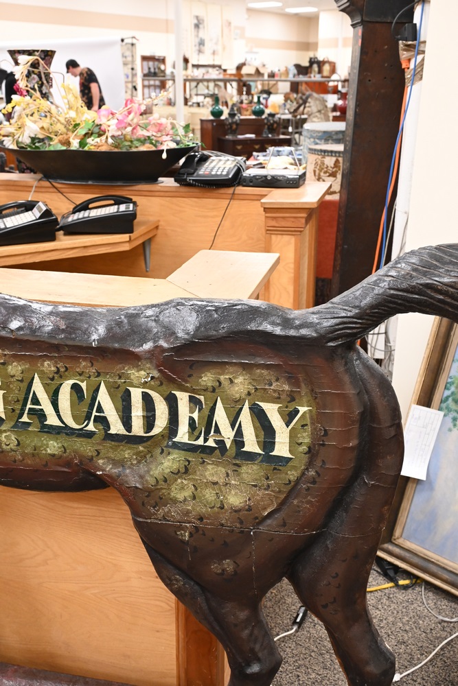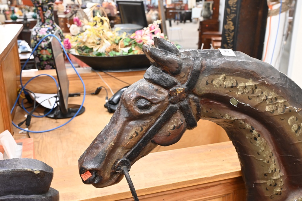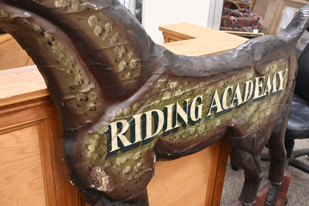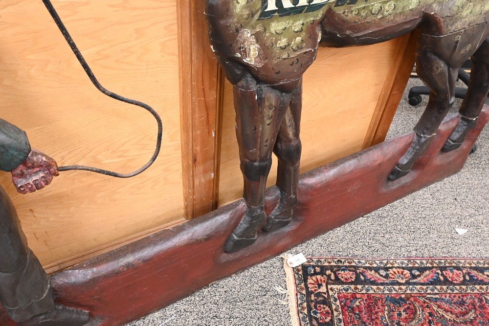 Lot 337: Horse and Jockey “Riding Academy” Standing Sign carved and painted wood circa 1840 or later height 56 inches, length 78 inches