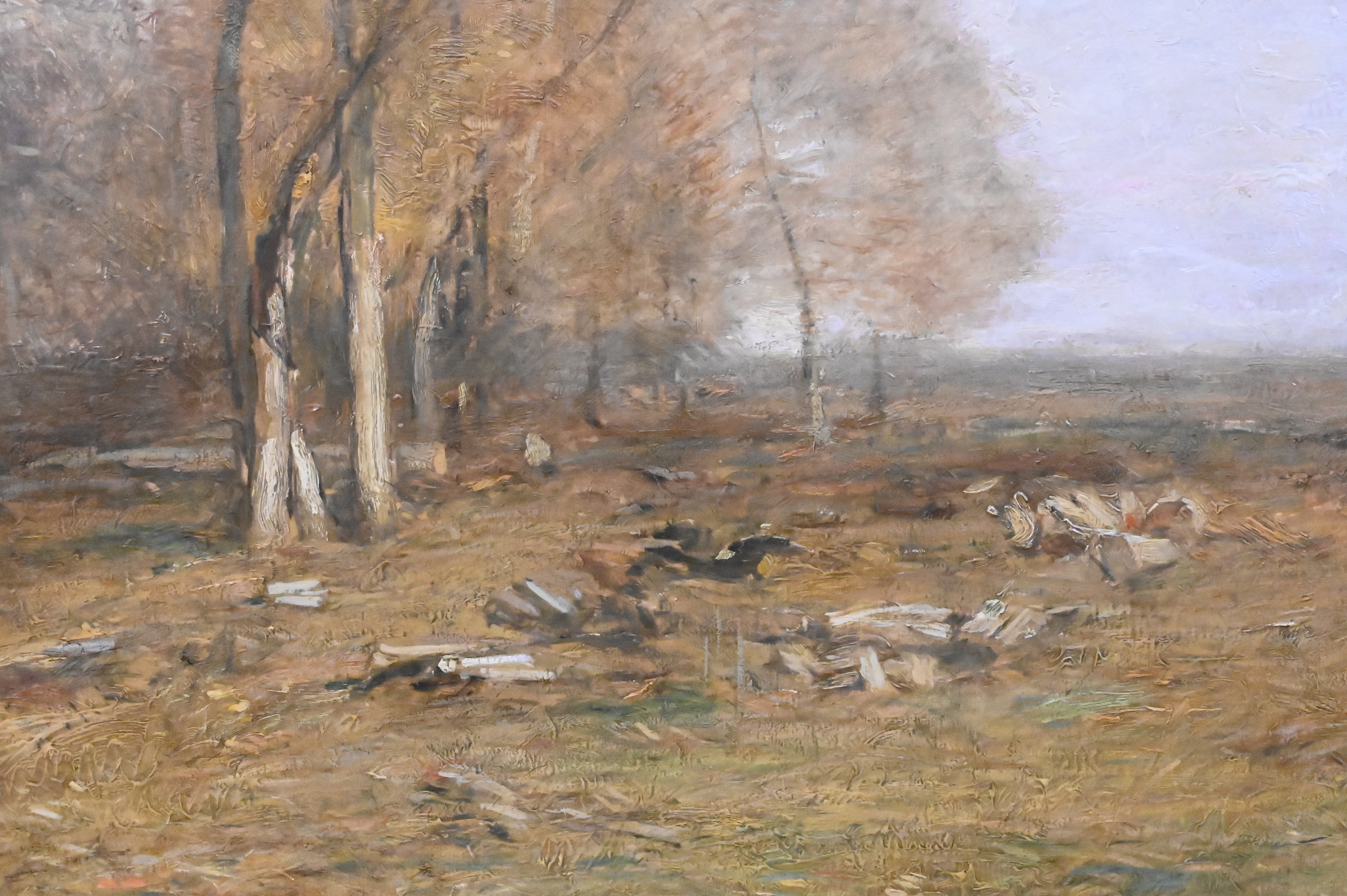 A tonal landscape depicting a quiet autumn field with felled trees and a grove of birches receding into a misty horizon; executed with the subdued palette and atmospheric subtlety that earned Murphy recognition as one of America’s foremost Tonalist painters