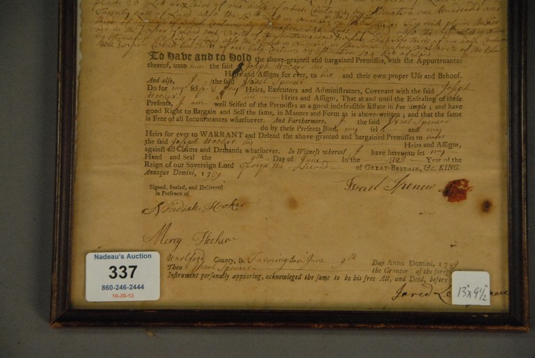 Land deed Farmington, CT To Joseph Hooker 1759.
