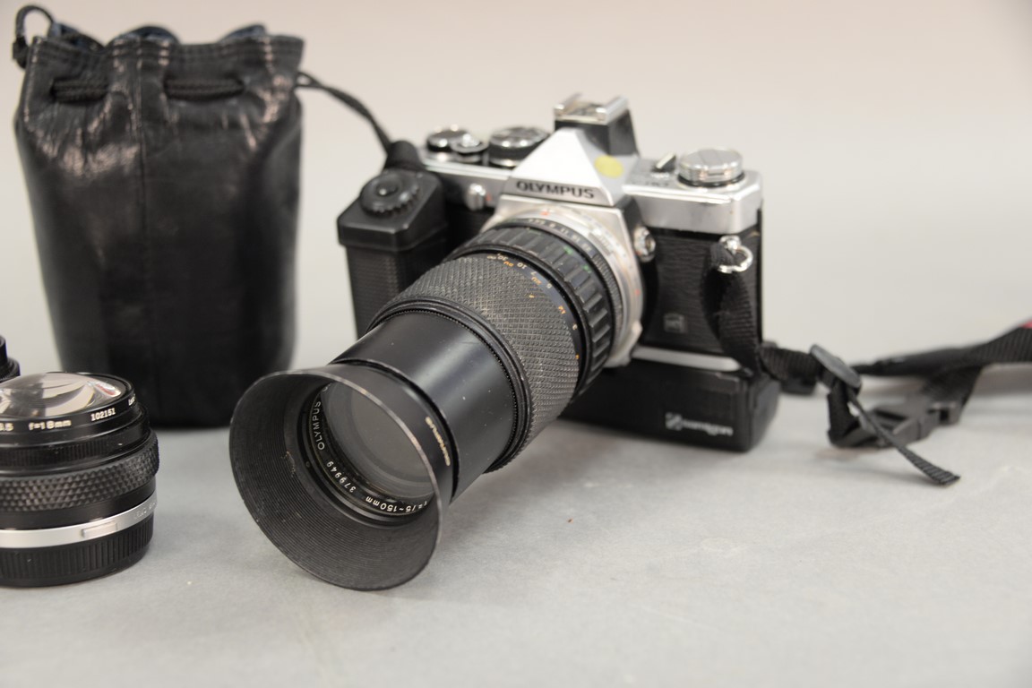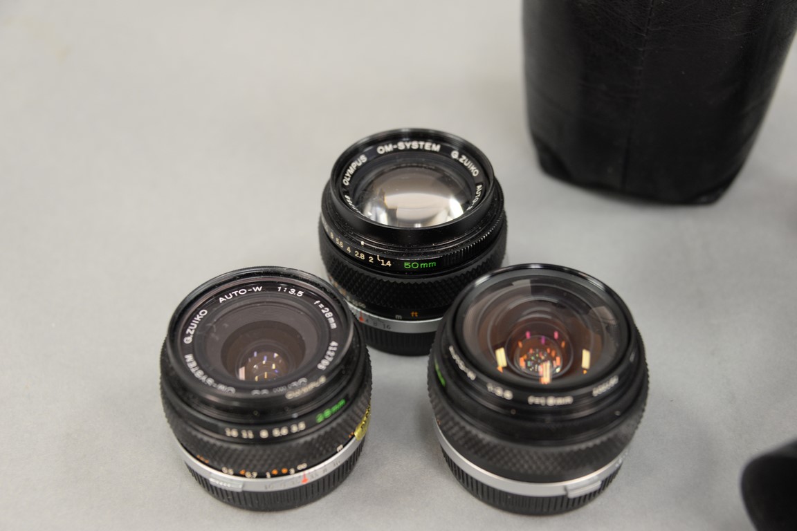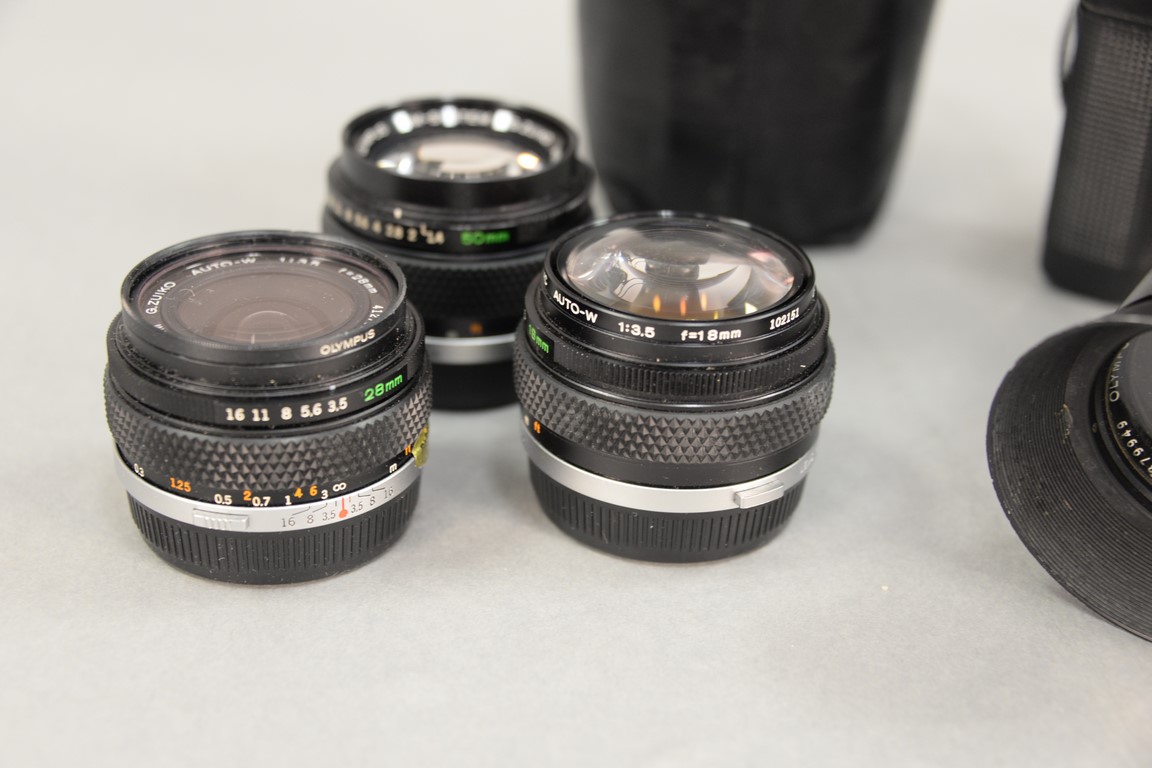 Lot 337: Olympus OM-2 camera with lenses 75-150mm, G. Zuiko 1:1.4 50mm, 1:3.5 28mm, 1:3.5 18mm om-system flash.
