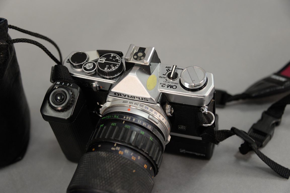 Olympus OM-2 camera with lenses 75-150mm, G. Zuiko 1:1.4 50mm, 1:3.5 28mm, 1:3.5 18mm om-system flash.