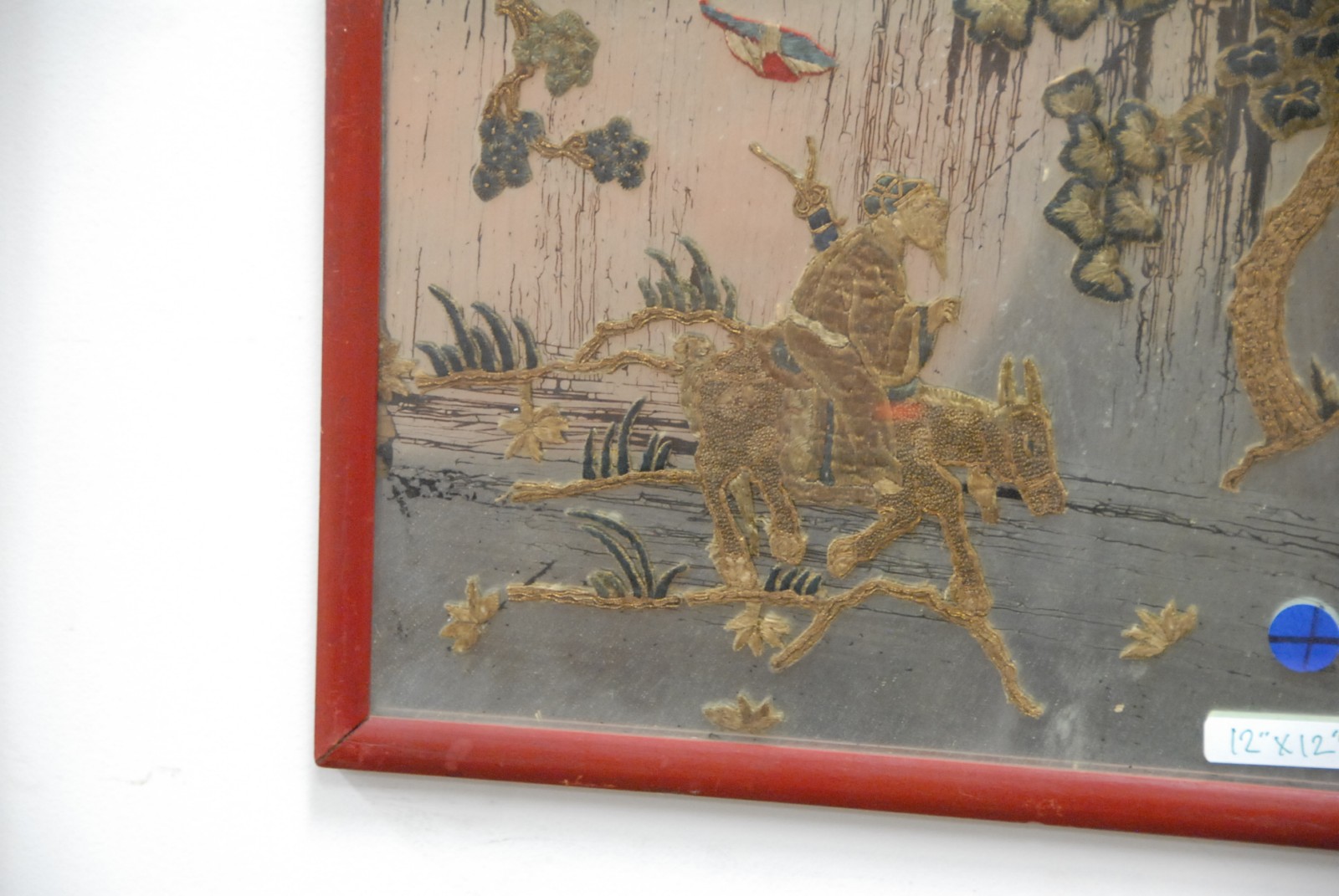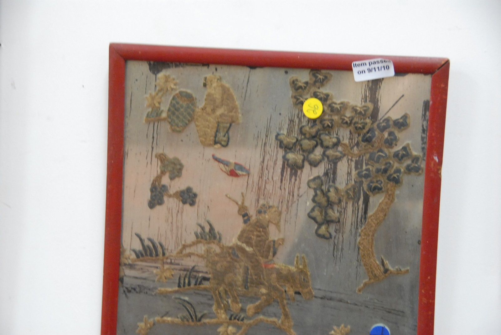 Pair of Oriental embroideries mounted over a mirrored background.