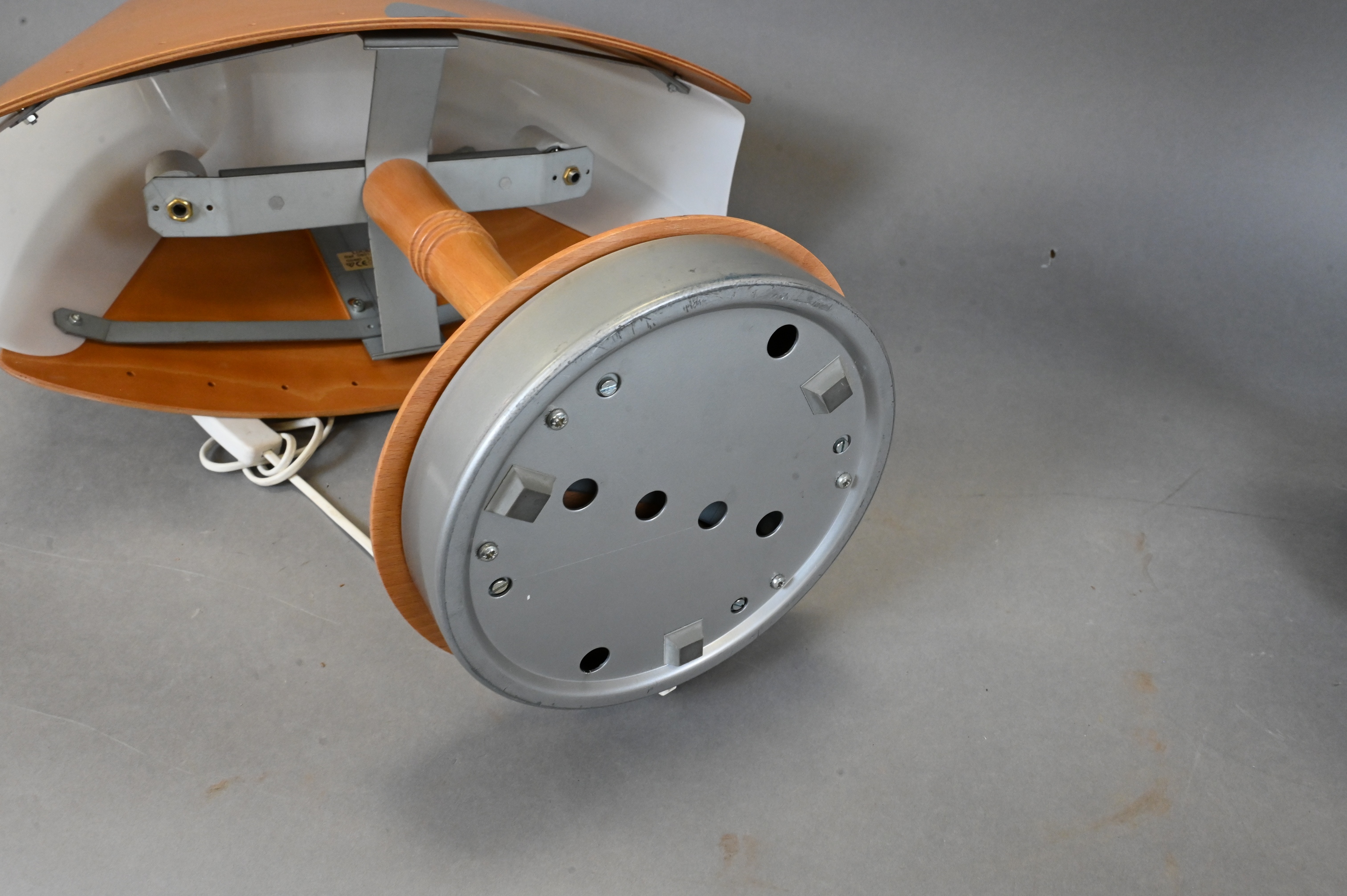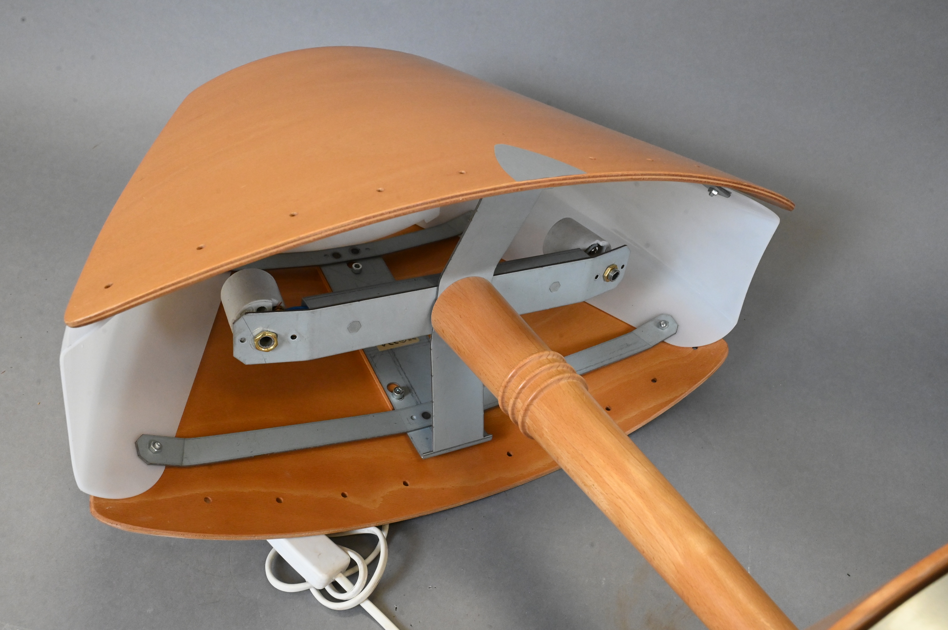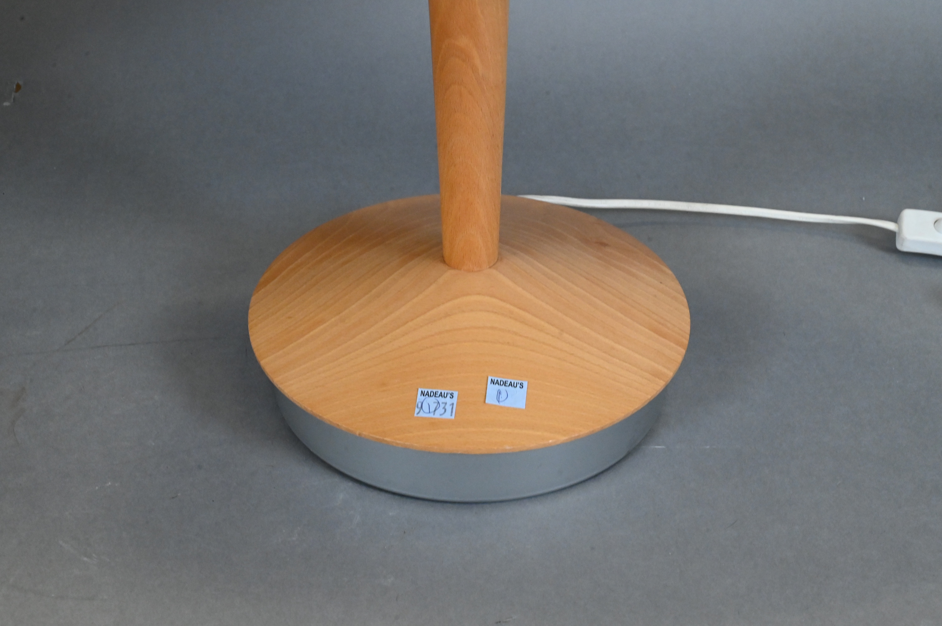having white acrylic and beech wood cone shaped lamp shade over tapering body, ending in round wood and metal base