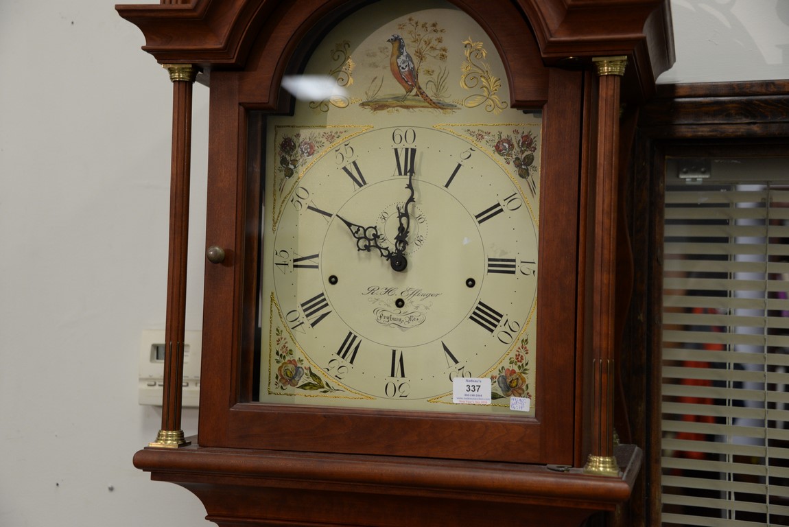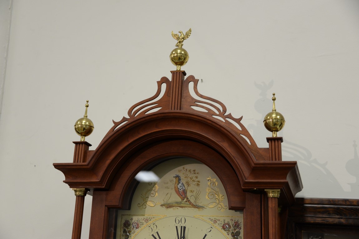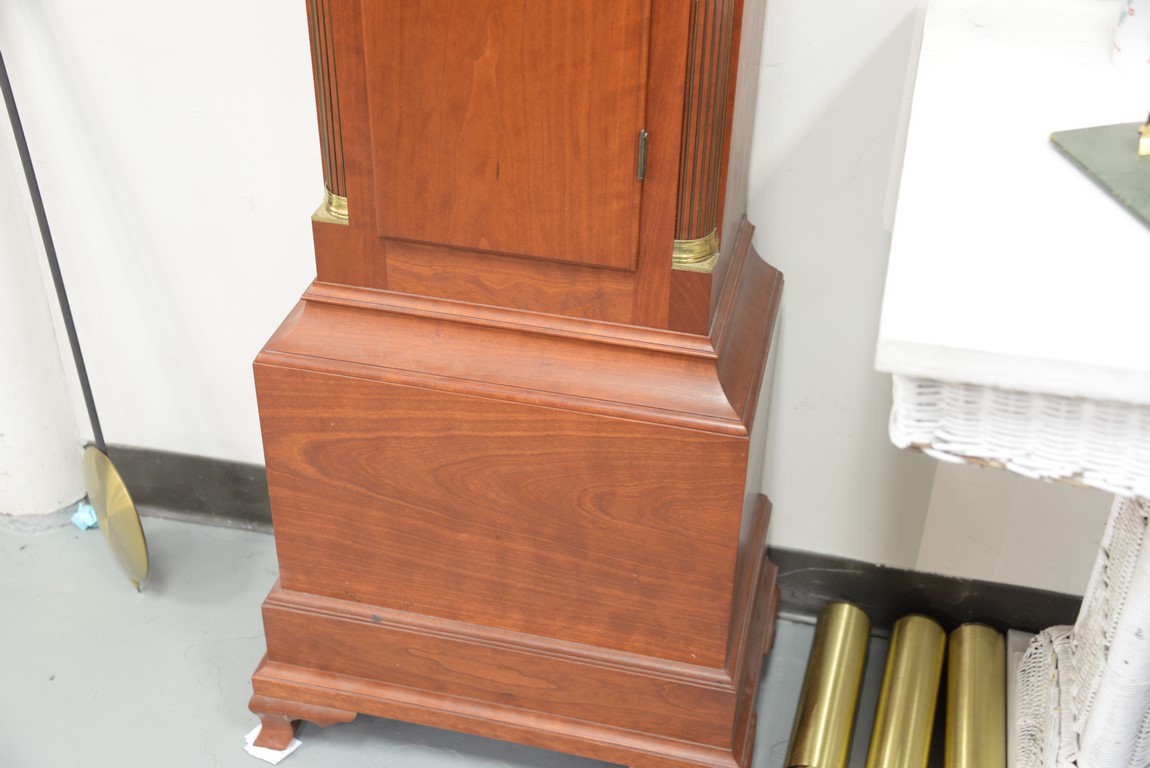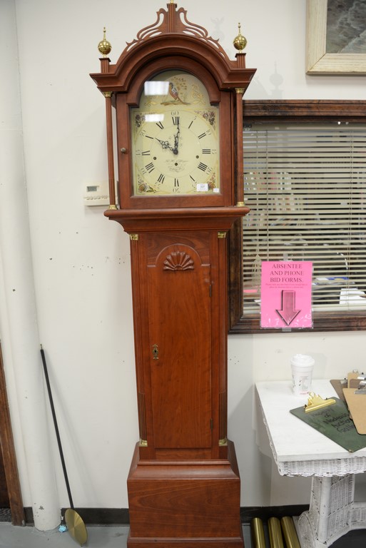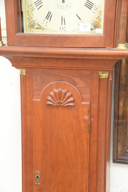 Lot 337: R. H. Effinger cherry tall case clock having shell carved door flanked by brass stop fluted quarter columns, all set on ogee feet, b…