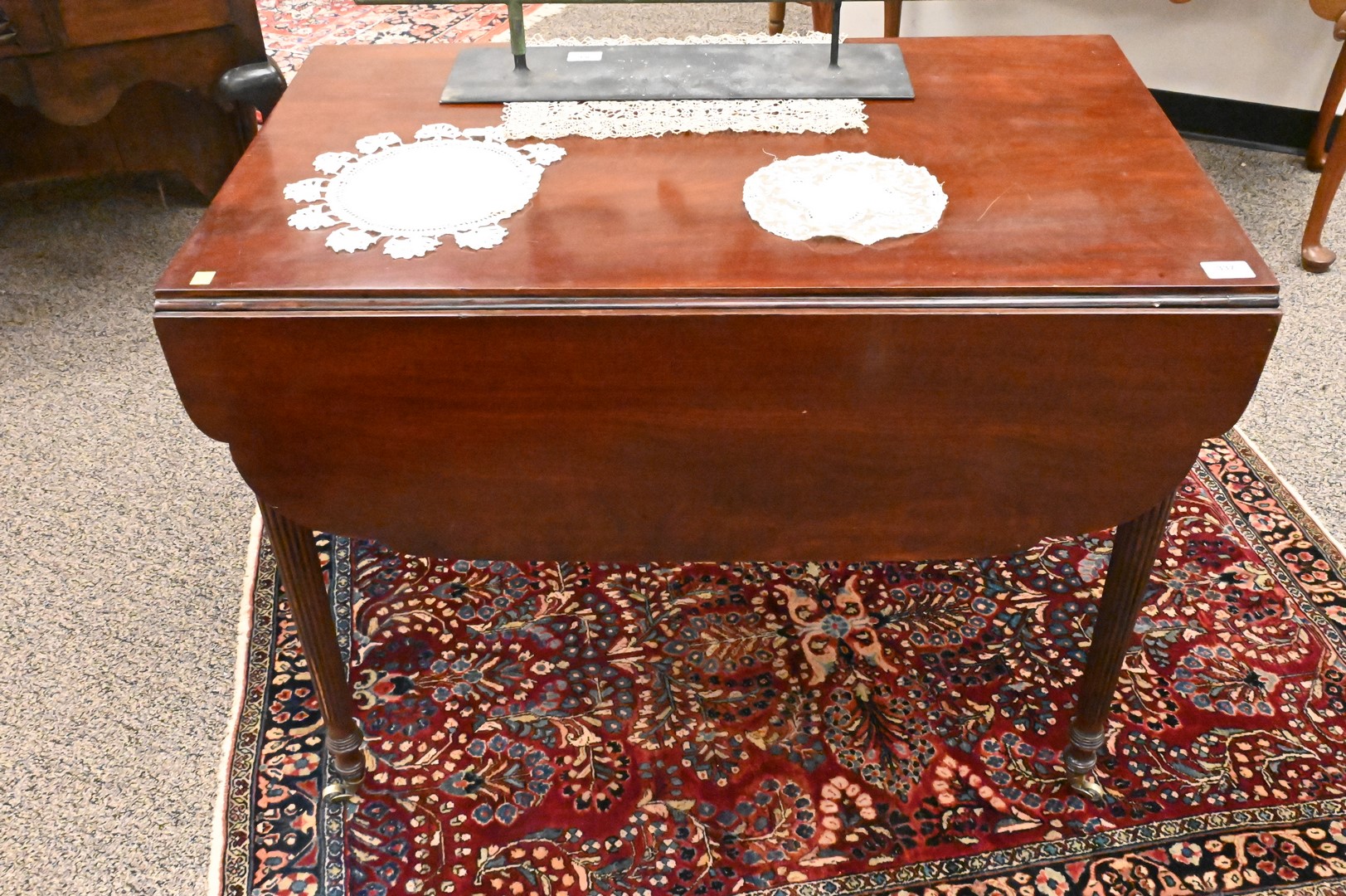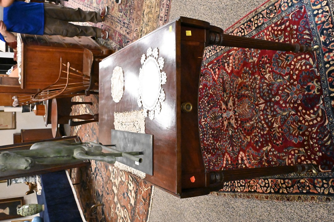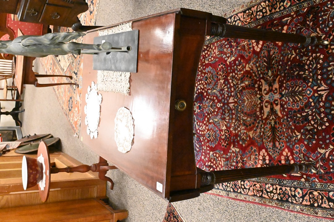 Sheraton Mahogany Pembroke Table, having shaped drop leaves, along with concave faux drawer ends, set on turned and fluted legs, circa 1820, height 28 1/2 inches, top 22″ x 37″.