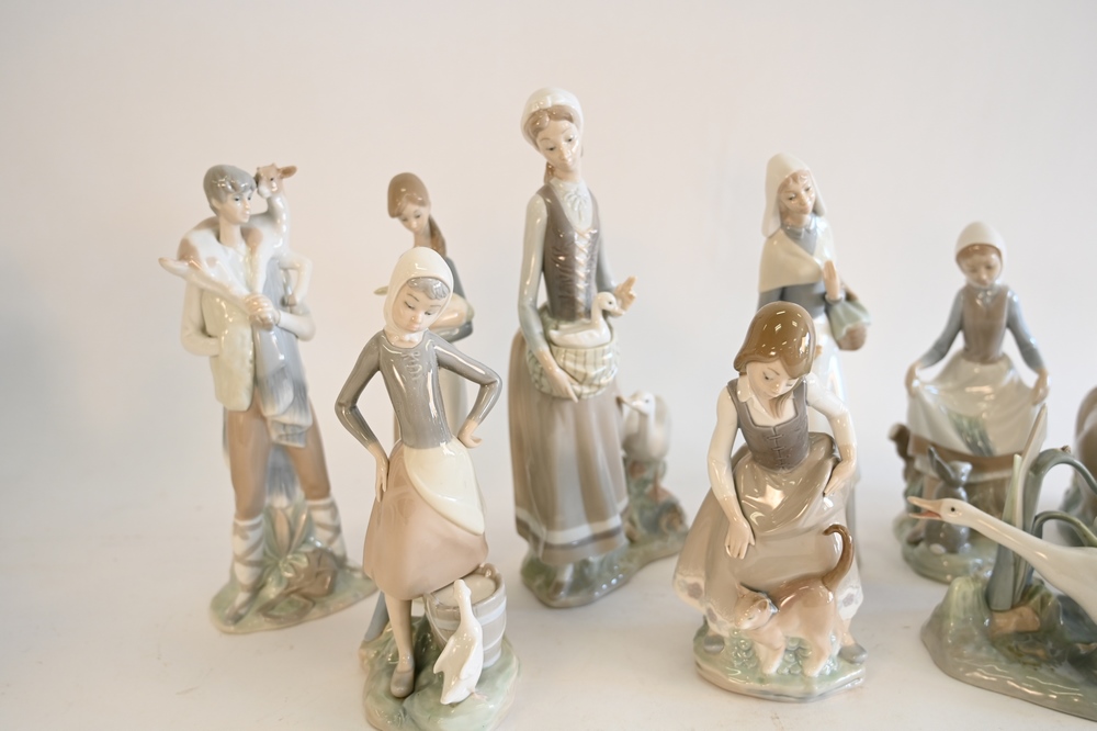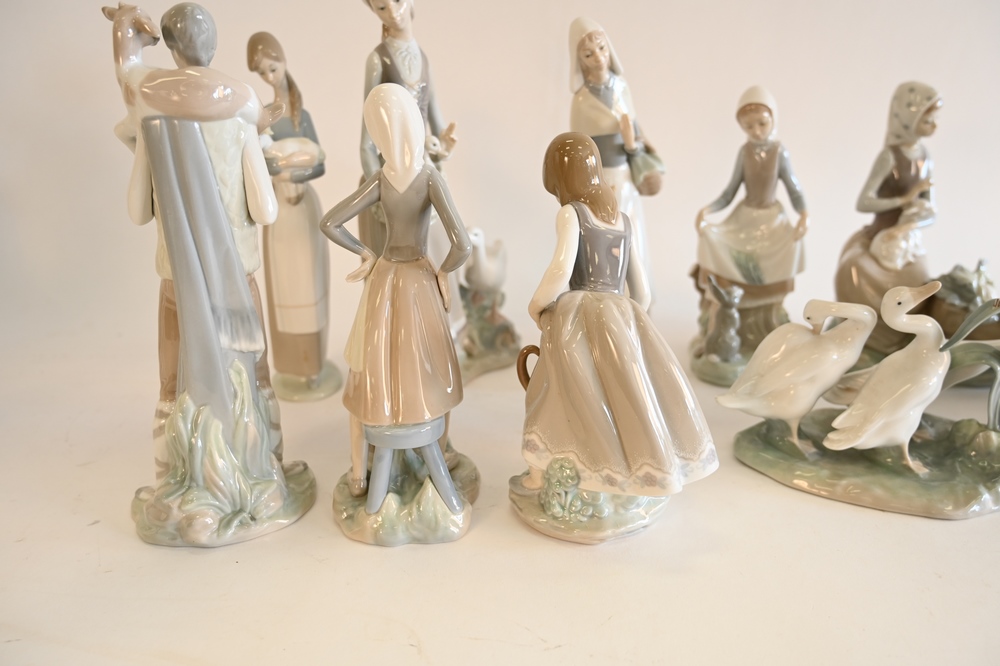 Ten Piece Lot of Lladro Porcelain Figures, to include several children with animals, along with one having three white ducks, severa…