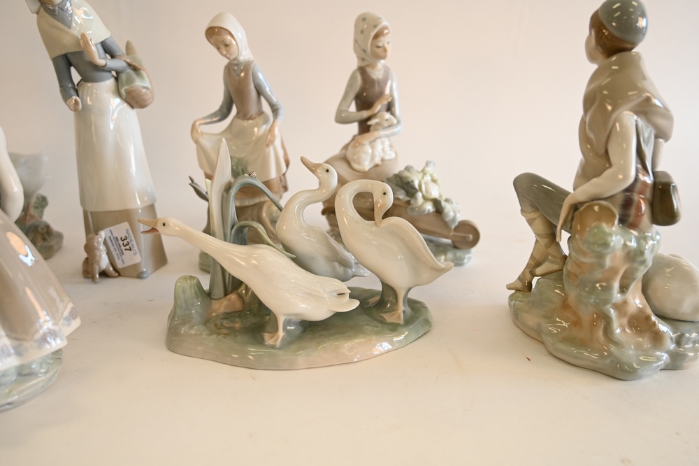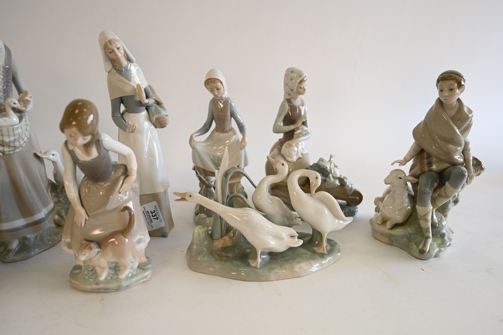 Lot 337: Ten Piece Lot of Lladro Porcelain Figures, to include several children with animals, along with one having three white ducks, several accompanied by original box, height of tallers, 12 1/4 inches.