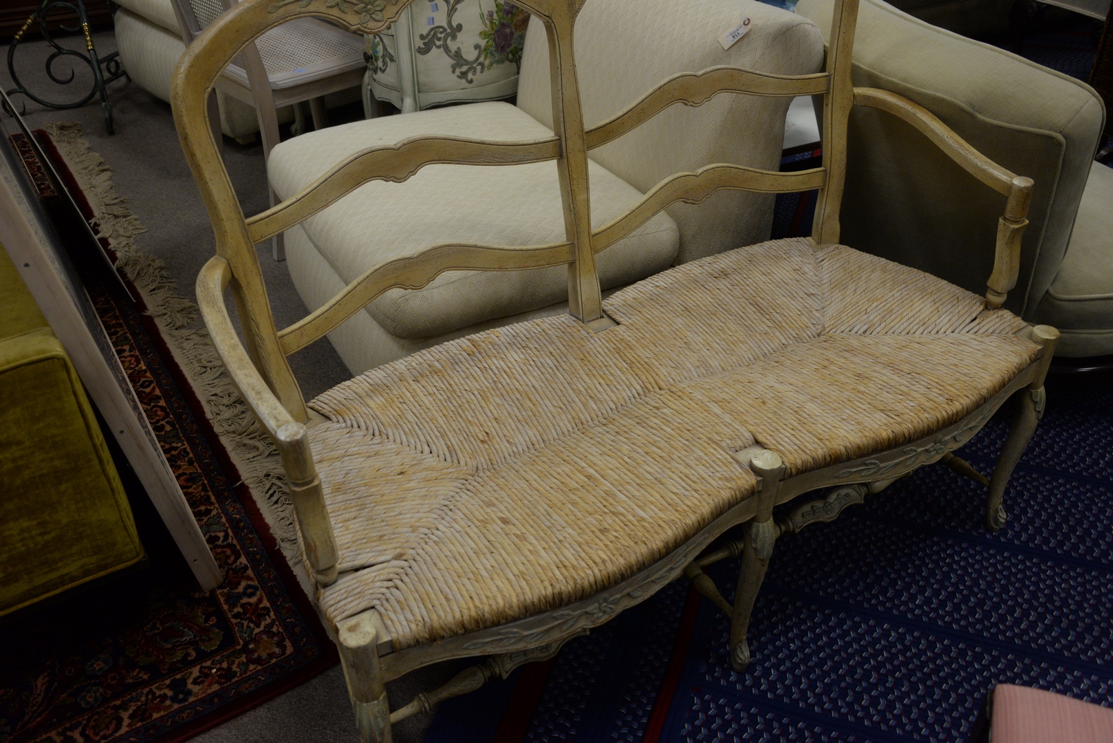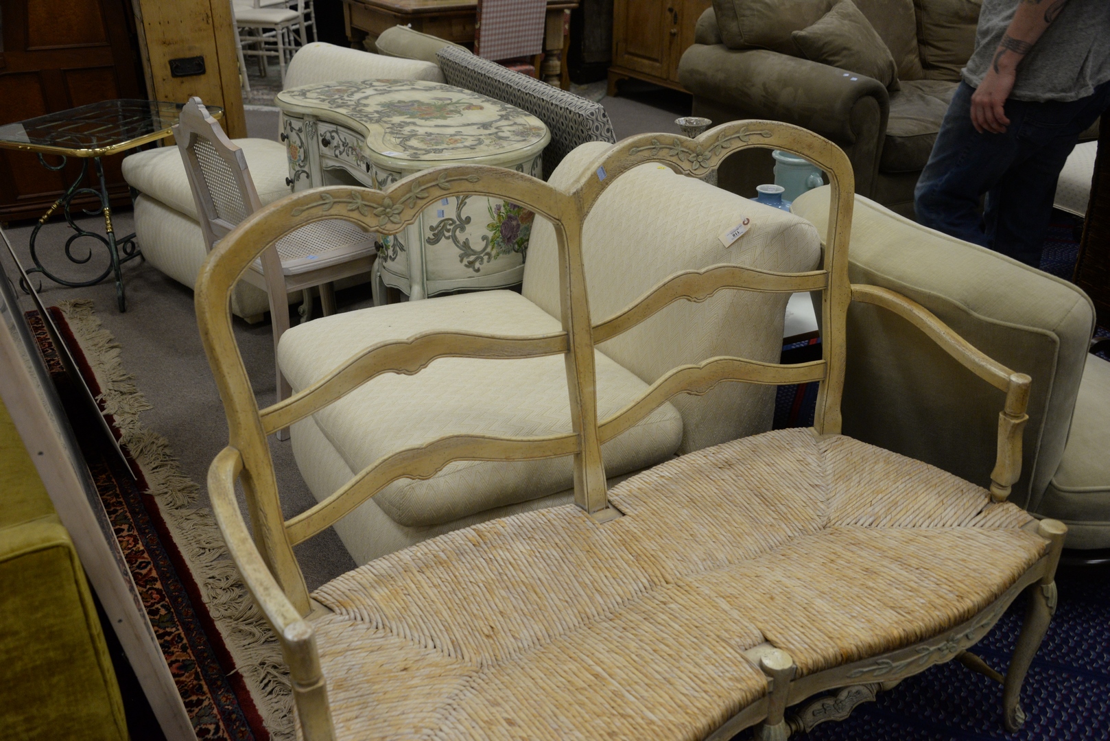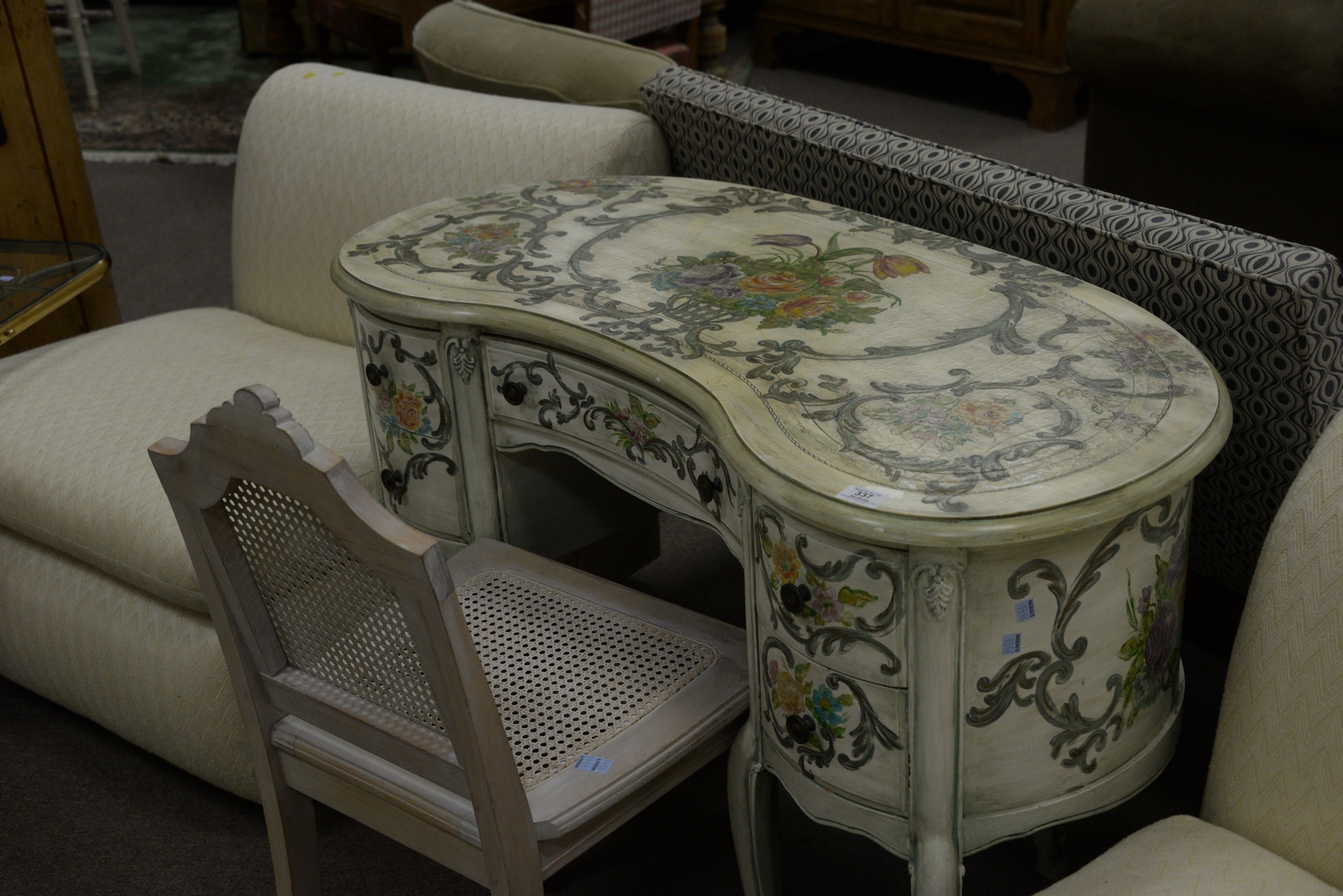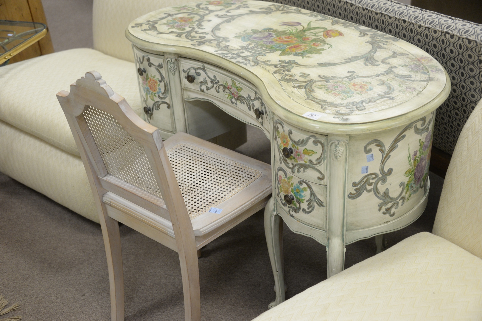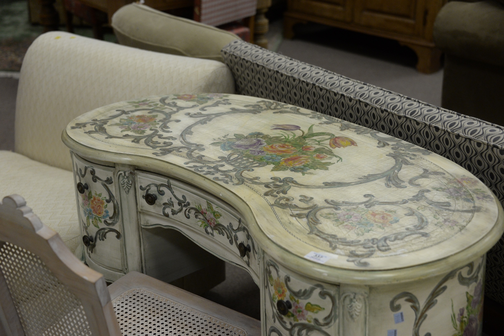 Lot 337: Three piece lot to include a Kidney Shaped Vanity/Desk having leather top and overall paint decorated; a side chair, height 30 1/2 inches, top 18 1/2″ x 43″; along with a country style bench.