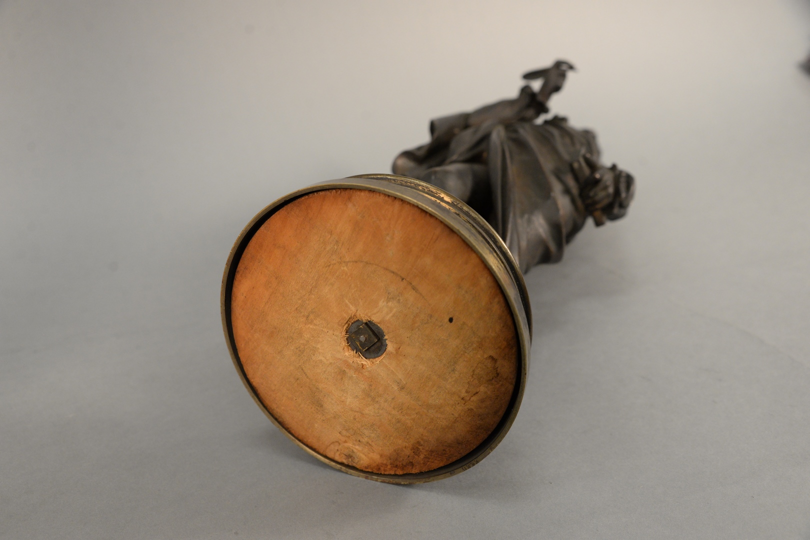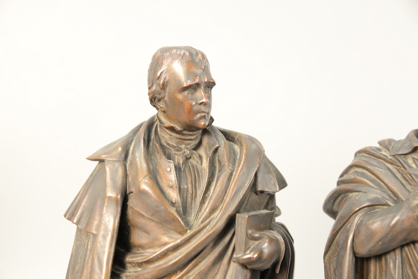 standing figure of a poet holding a book, and a quill pen, along with a figure of a man holding a book, and a cane, on round base