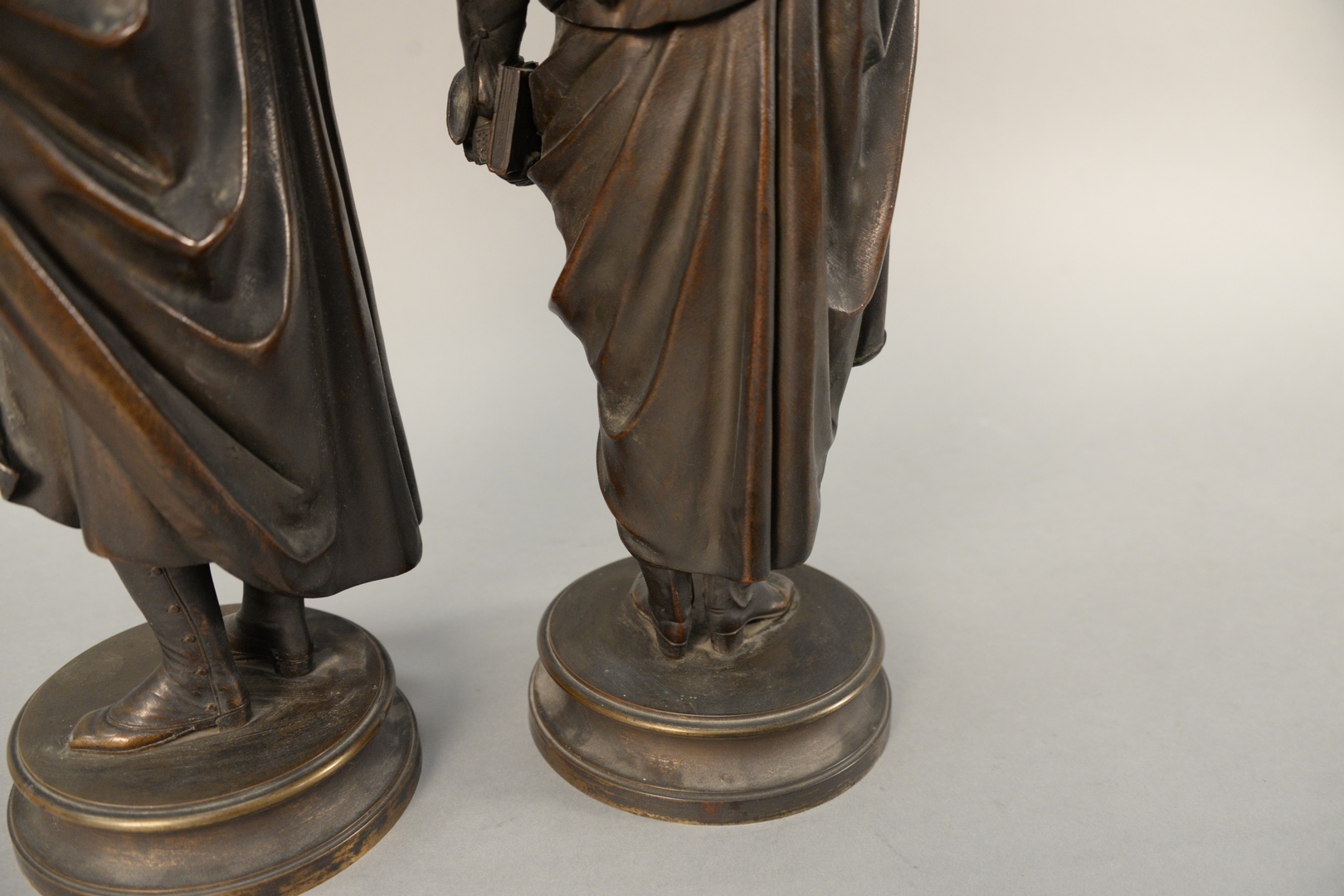 Lot 337: Two Bronze Figural Statues standing figure of a poet holding a book, and a quill pen, along with a figure of a man holding a book, a…