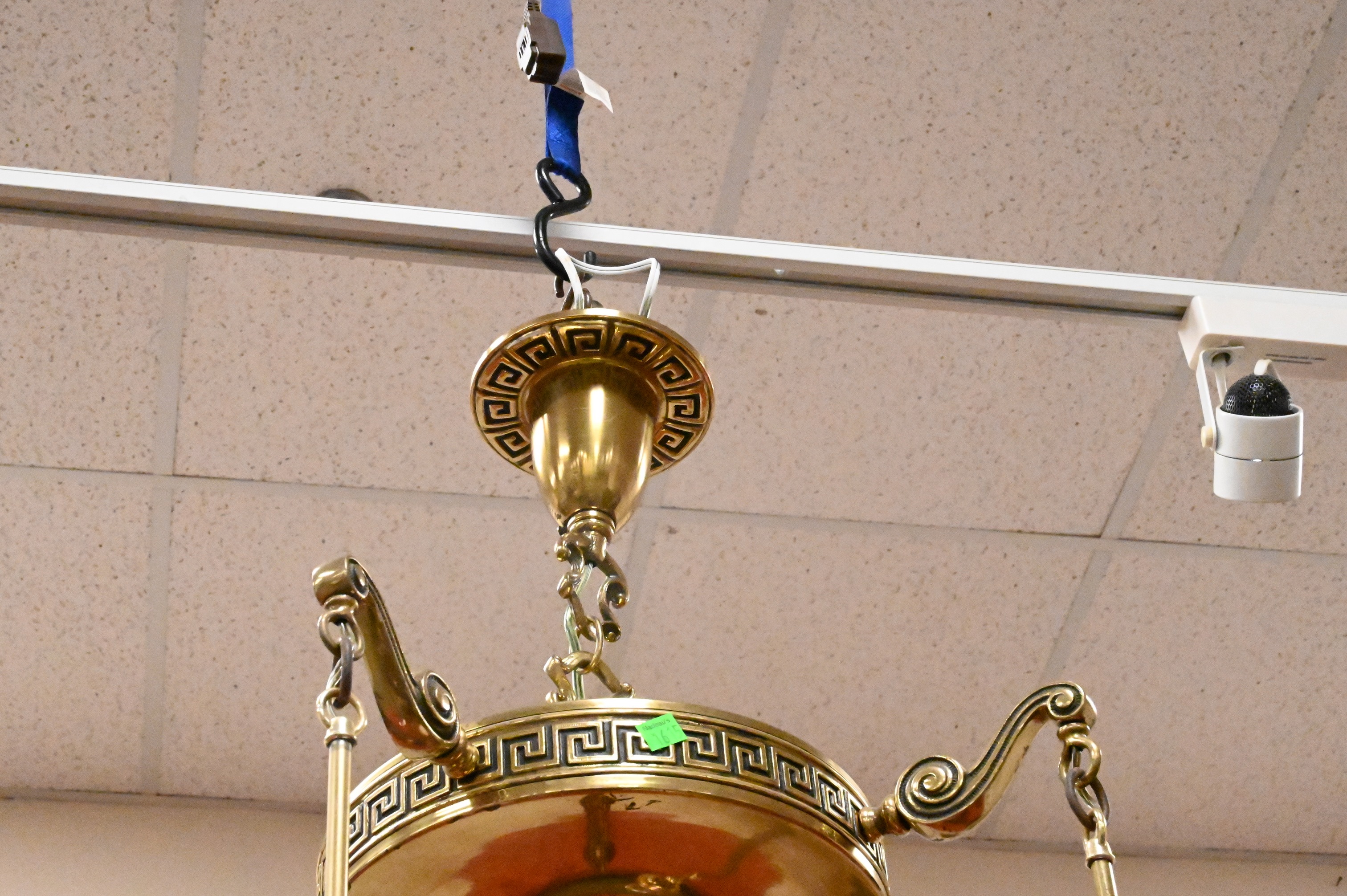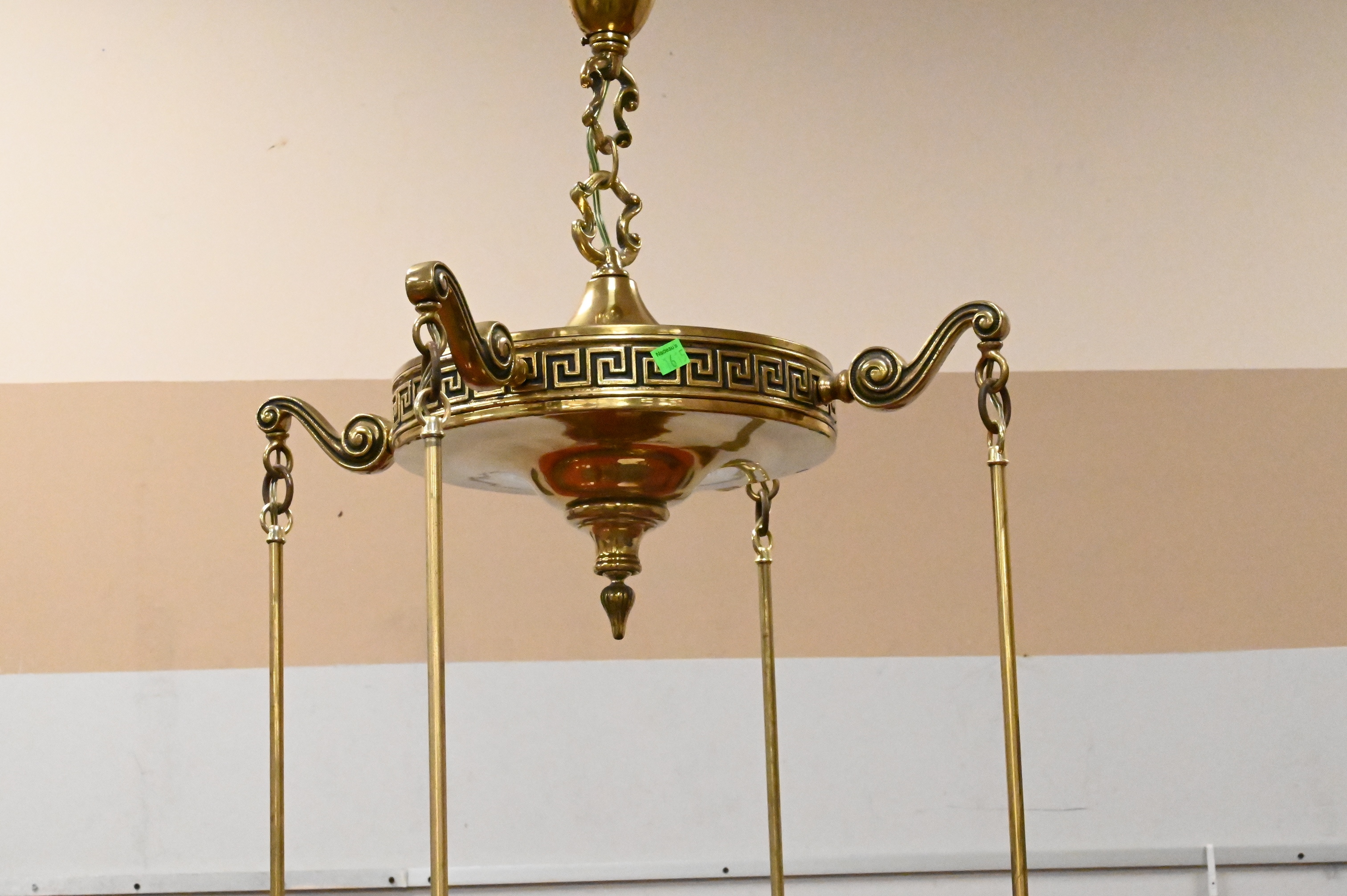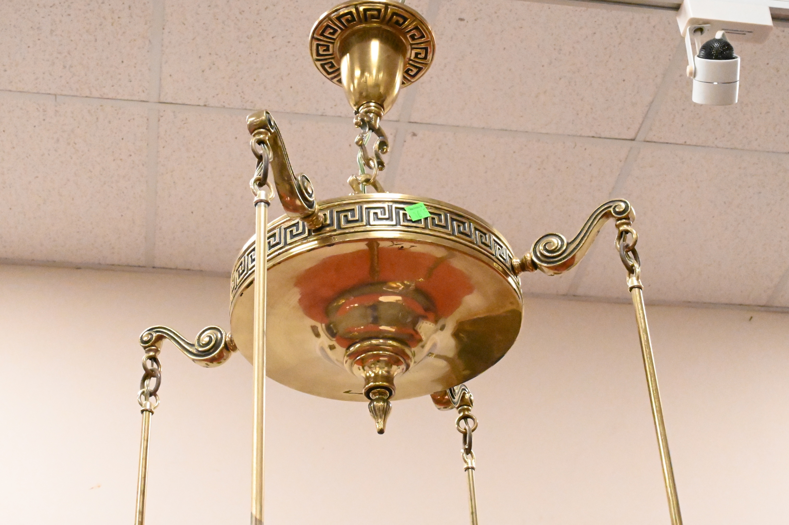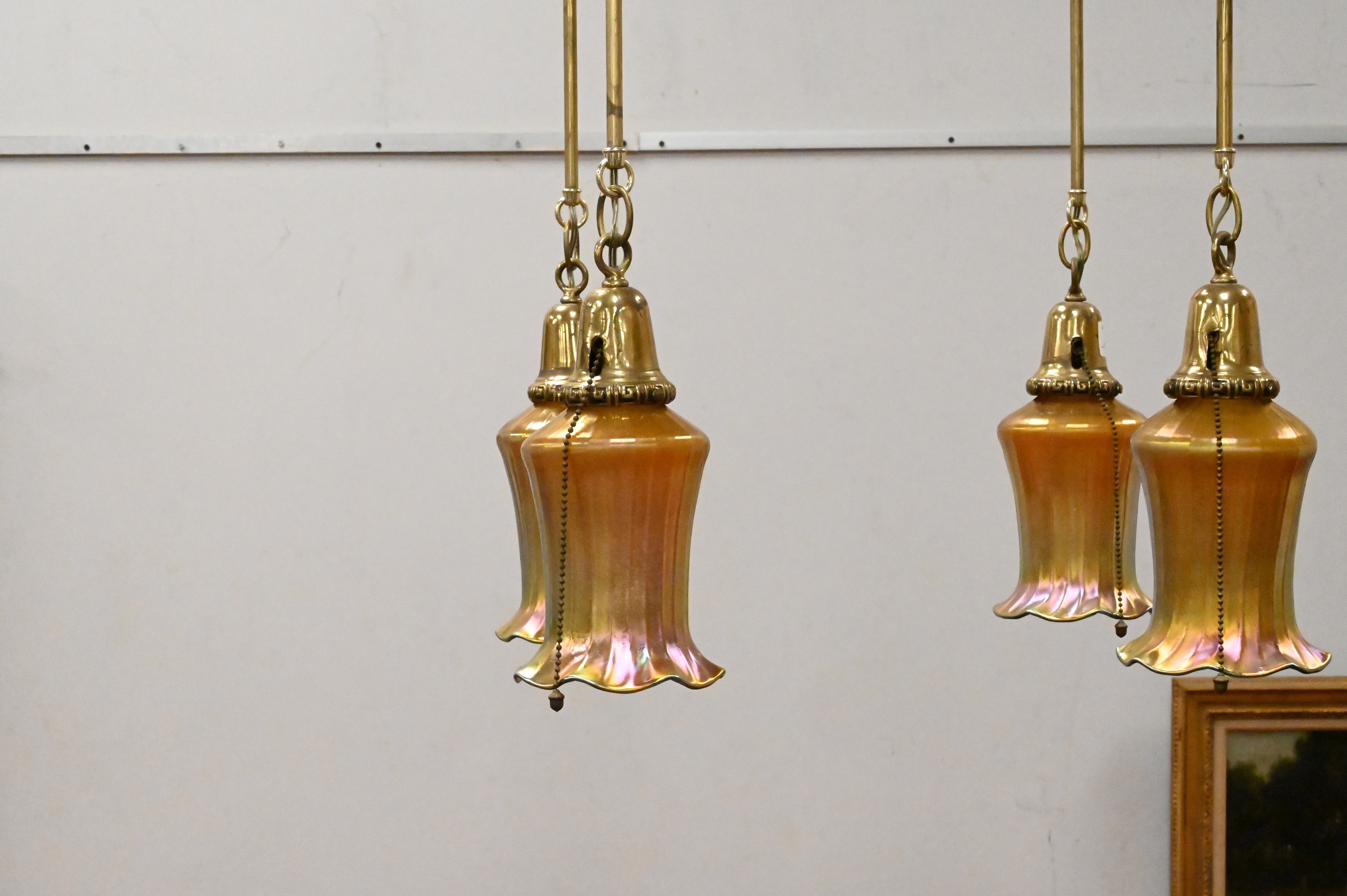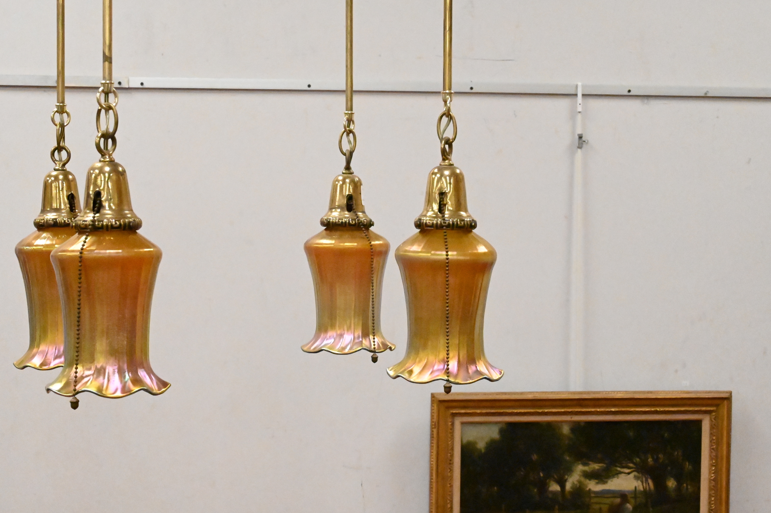 Brass Hanging Light, with four art glass shades, Total Height 42 inches, (with apron pulls) , height can be shortened by 14 inches, Provenance: A Private Connecticut Shoreline Collection