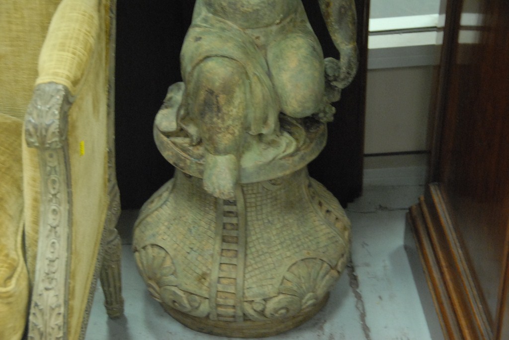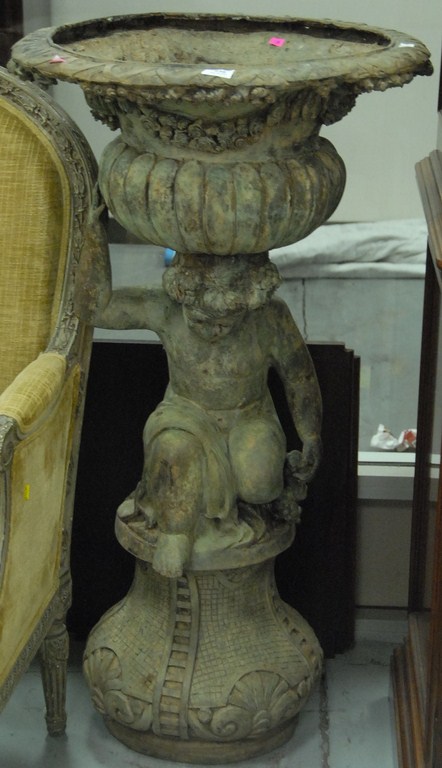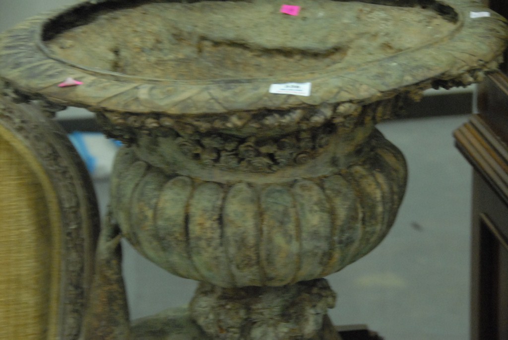 Bronze urn on cariot on base, 20th century. ht. 44in.
